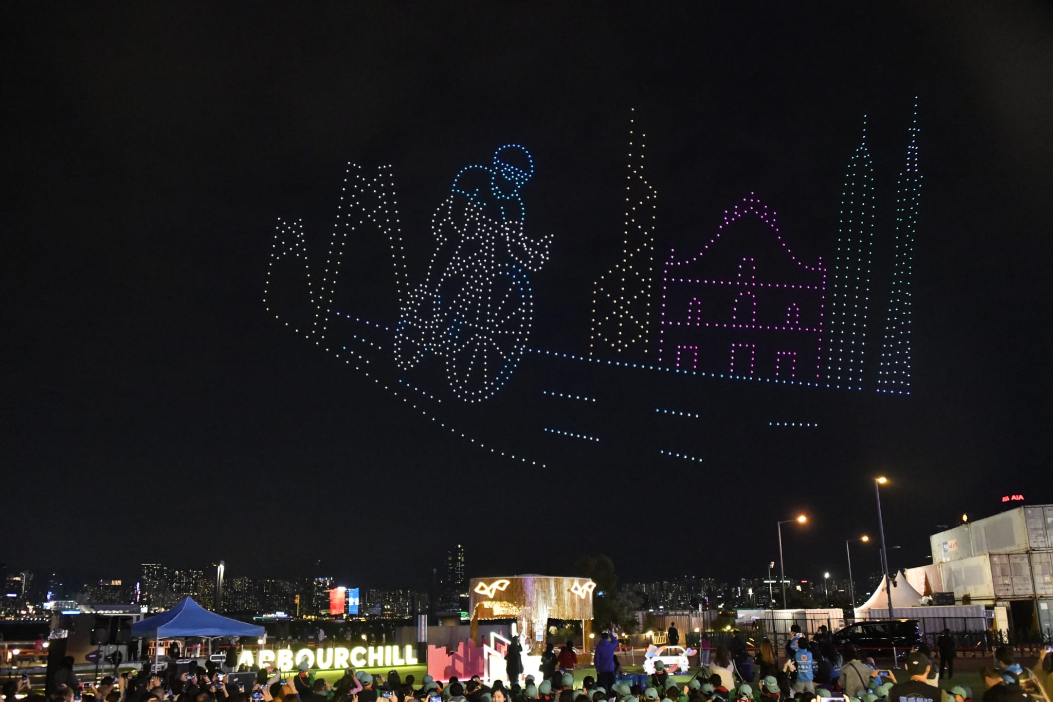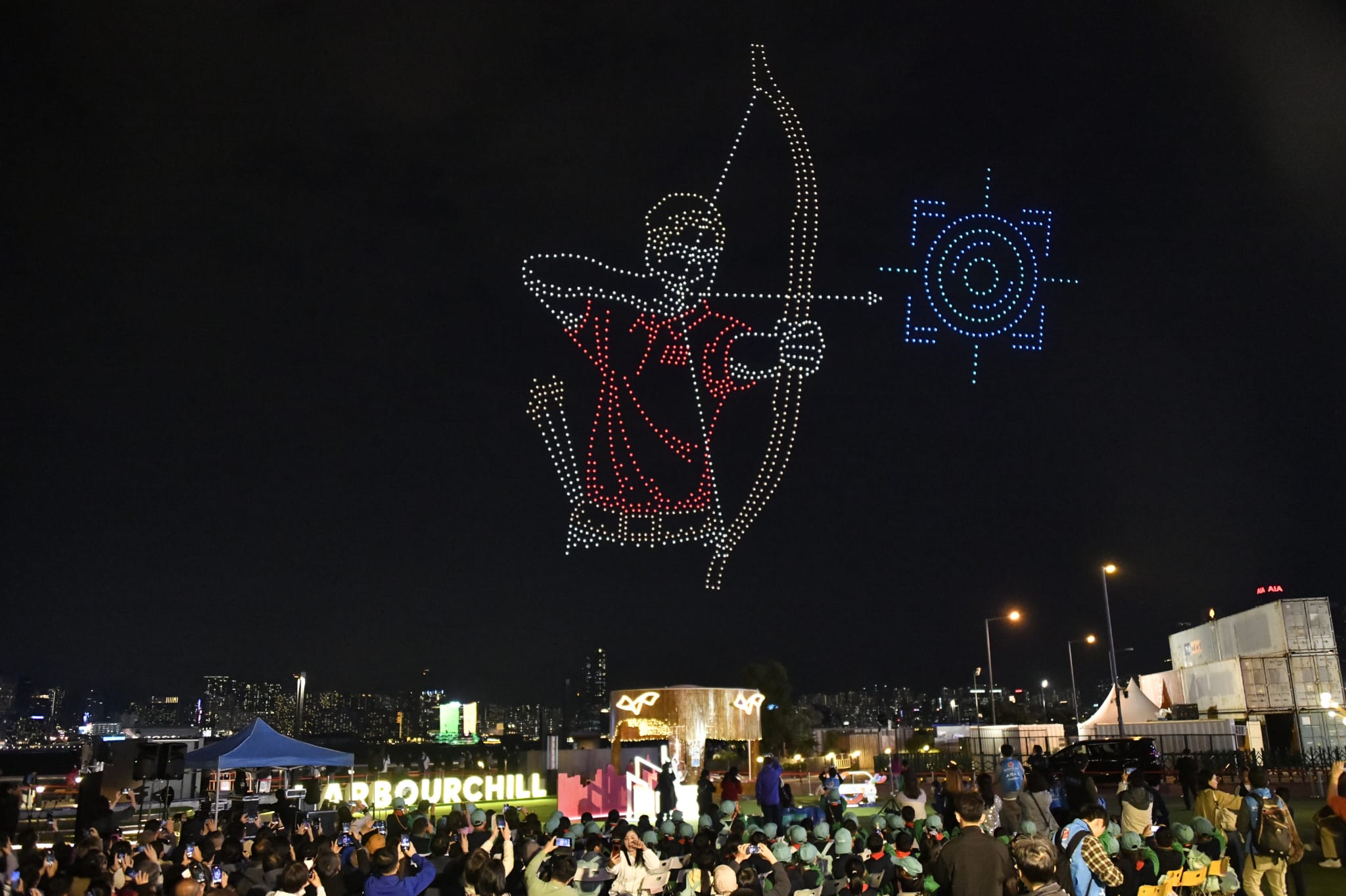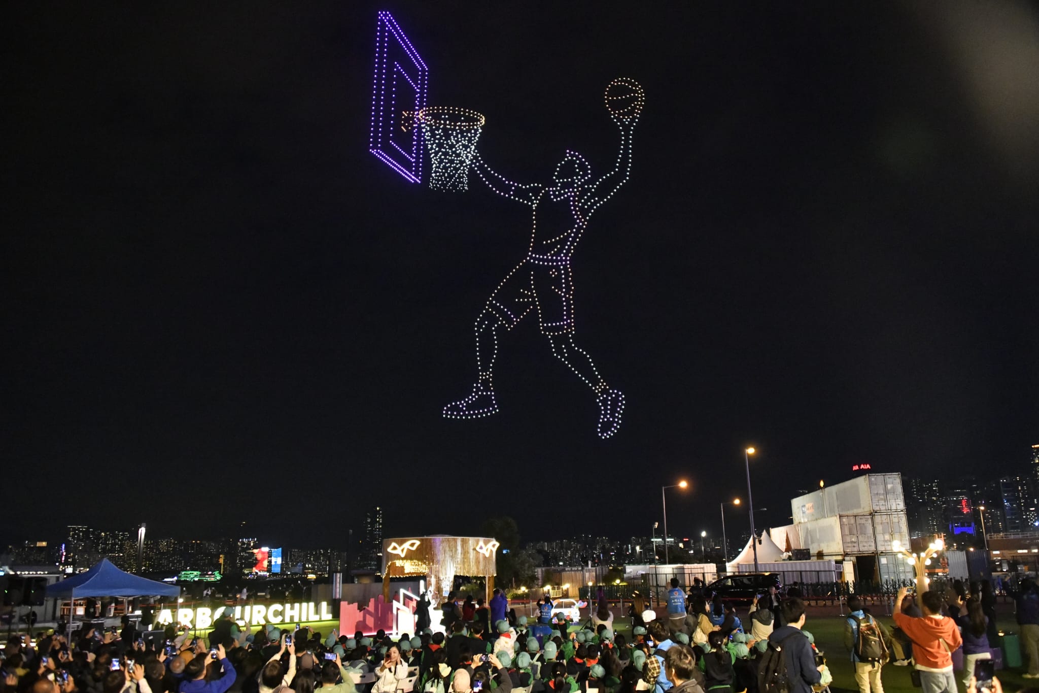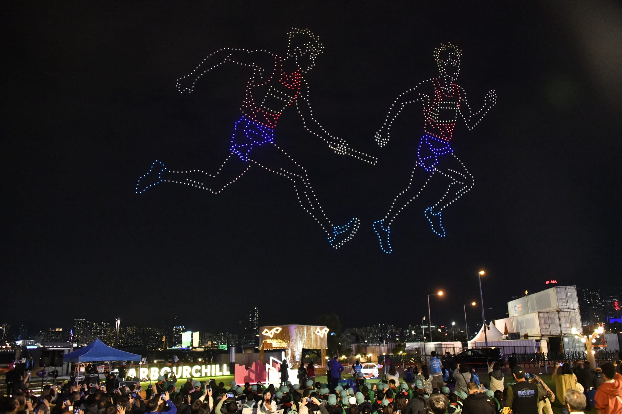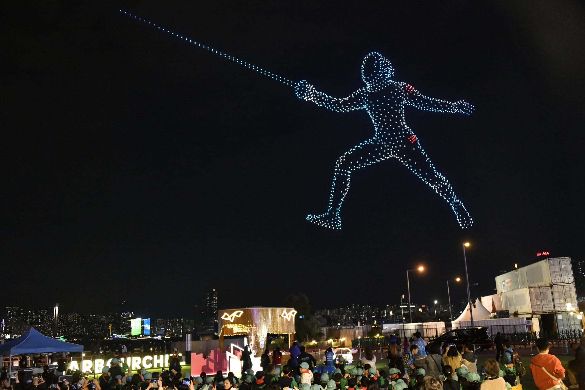 灣仔海濱今晚八時迎來本次活動的重頭戲「體育力量 閃耀香江」大型無人機表演。1200架無人機編隊瞬間騰空而起,在維港夜空勾勒出一幅幅震撼人心的立體圖景。包括全運會吉祥物中華白海豚「喜洋洋」及「樂融融」踏浪躍動,傳遞火炬與運動激情;擊劍、飛人扣籃、箭射十環、賽場接力等體育項目依次閃現,與全運會賽場上的競技場景遙相呼應;港珠澳大橋化作賽道,香港、澳門、深圳三地標誌性建築依次浮現,展現大灣區共辦全運的協同力量。表演在「中華體育精神頌」「體育力量、中國精神」的巨型標語中圓滿落幕,猶如在灣區夜空鐫刻下體育精神的華彩樂章。 (記者 葉家亨/攝影 蔡啟文)