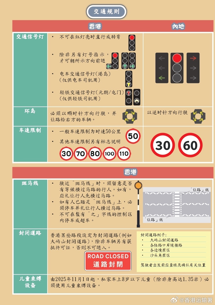 「粵車南下」入境香港市區將於12月23日起實施,運輸署今早(26日)在官方微博發文表示,內地與香港的道路設計和交通規則不同,為讓大家更安全、更順利適應香港的交通環境,署方和警方聯合發布多條視頻介紹實用要點。