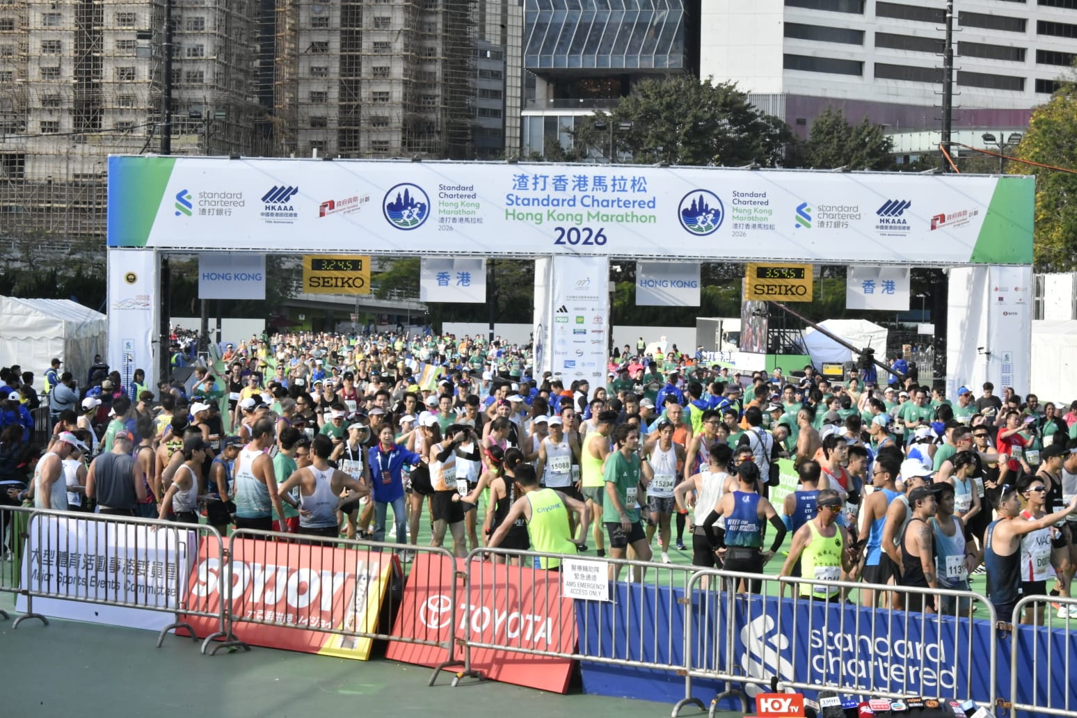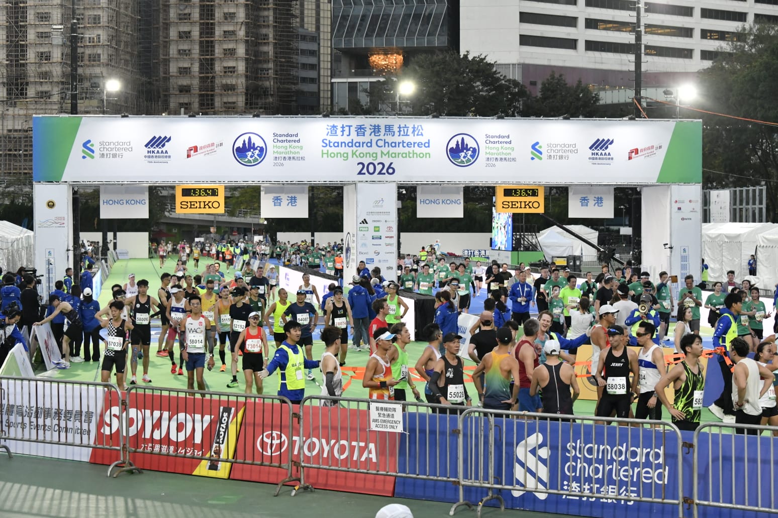 渣打香港馬拉松2026今晨(18日)開跑。賽事吸引約7.4萬名跑手參與,各組別已由清晨5時10分起陸續起跑。其中,全程馬拉松及半程馬拉松的跑手從尖沙咀彌敦道出發,而10公里賽事的跑手則以東區走廊為起點,終點全部設於維園。