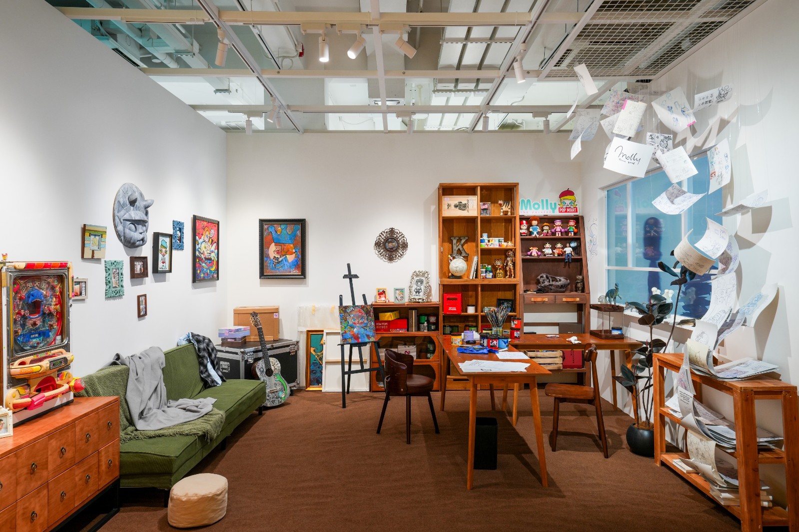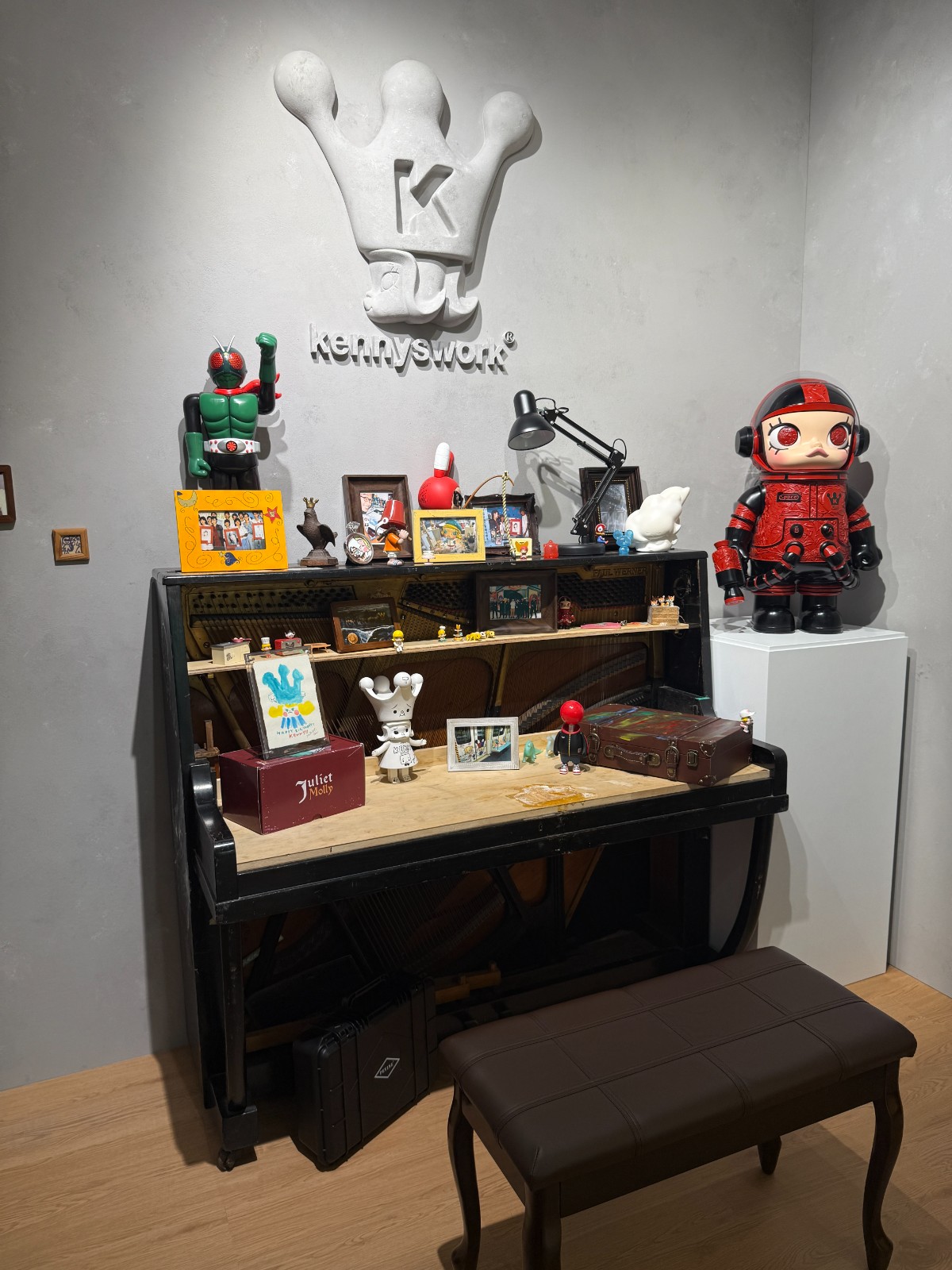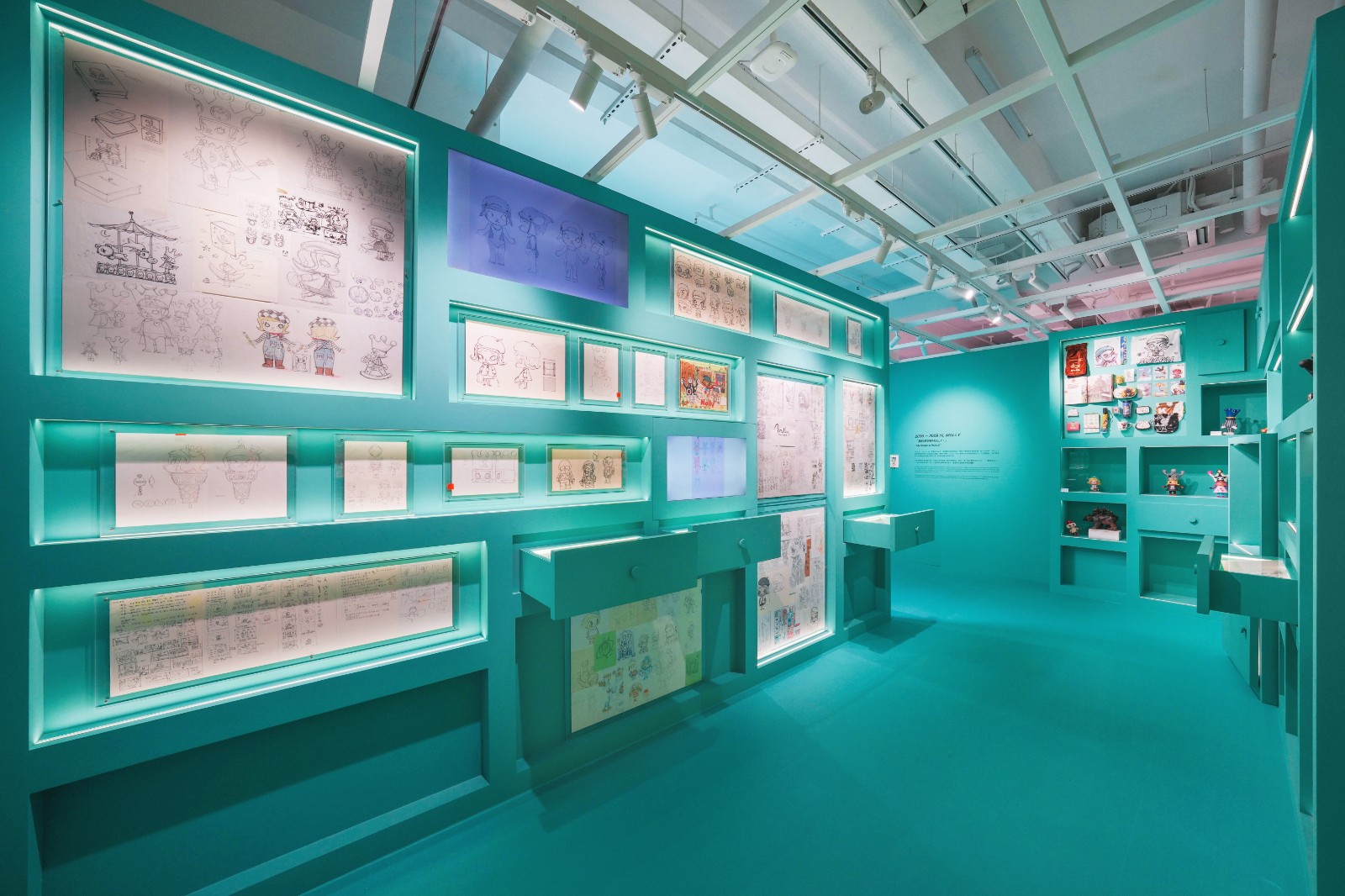 展區一會展示大量珍貴的創作手稿與經典作品,包括MOLLY初登場時的設定手稿與早期作品,如「第一隻小畫家MOLLY」,重溫溫暖的起點。展區二高度還原Kenny的工作室場景,放置藝術家以鋼琴改造的工作台,展出大量天馬行空的草圖、半成品及反覆修改的創作,讓觀眾彷如走進藝術家的工作室,感受一件作品從想法到完成之間的反覆琢磨與堅持。展區三展示過去十年間與POP MART展開長期合作、推出的多個經典系列作品。展廳盡頭的,則呈現太空景象,象徵角色與創作旅程邁向更廣闊的未來