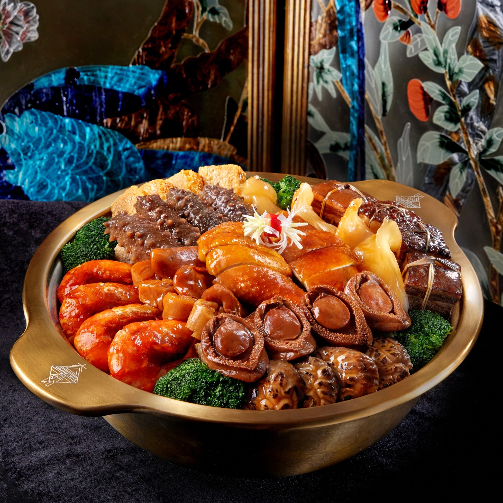 餐廳同時推出兩款超豪賀年菜「極品珍味盆菜」及「金腿濃湯鳳吞翅」,前者一鍋匯聚山珍海味,是「海陸空」盛宴,原隻38頭吉品鮑魚、高湯燴花膠、日本遼參、生曬金蠔,還有餐廳招牌稻草肉,每樣食材各具獨特風味,層次豐富,最適合一家大小圍爐分享。金腿濃湯鳳吞翅是心機功夫菜,以原隻三黃雞完美去骨,內裏釀入足料牙揀翅,再以老雞、赤肉同西班牙火腿熬成金黃濃湯慢煨,湯鮮味濃,每一口都是傳統手工的演繹。