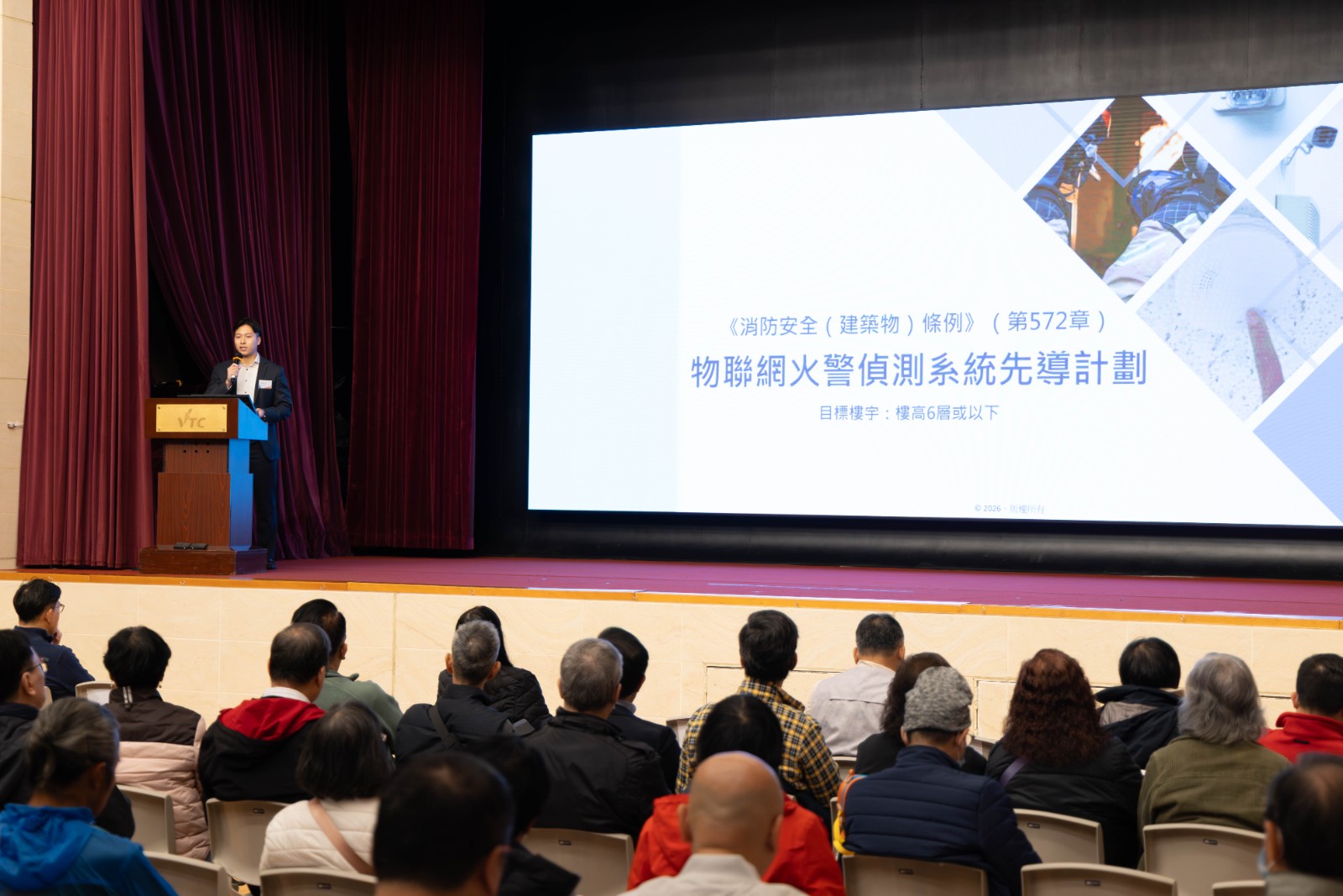 講座由消防處代表和職訓局專家主講。消防處高級消防隊長蘇津鋒介紹如何推動科技應用,包括去年引進的「物聯網火警偵測系統」先導計劃,以提升舊式樓宇消防安全水平。職業訓練局相關範疇專家講解住宅消防及建築安全相關法例與責任、住宅建築物及防火物料的測試標準與認可檢測,以及住宅物業日常安全管理與事故應變策略等,附以實例分析,讓參加者獲益良多。