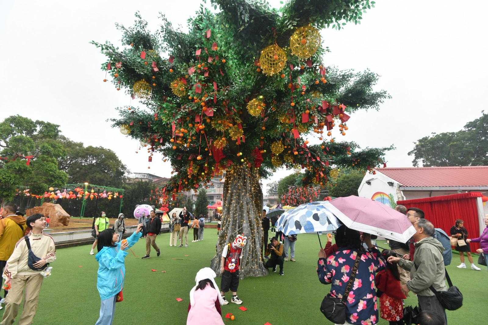 大埔林村現場雖然下起毛毛細雨,仍然無阻市民共同慶祝節日興致,多人在許願樹對開拋寶牒祈福,有人一擊即中,亦有人再接再厲,嘗試多次終於成功將寶牒拋上許願樹。首次到訪林村的德國遊客Rolf向港商記者表示,現場氣氛非常熱鬧,認為是一個慶祝農曆新年佳節必到的熱門地方,因此他特意帶同家人一起遊覽,期間曾經拋寶牒祈福。將會逗留香港九日的Rolf又說,得悉沙田馬場大年初三將會舉行賀歲賽馬日,假如當日有時間,或會入場「行個大運」應節,以及投注心儀馬匹考驗眼光。