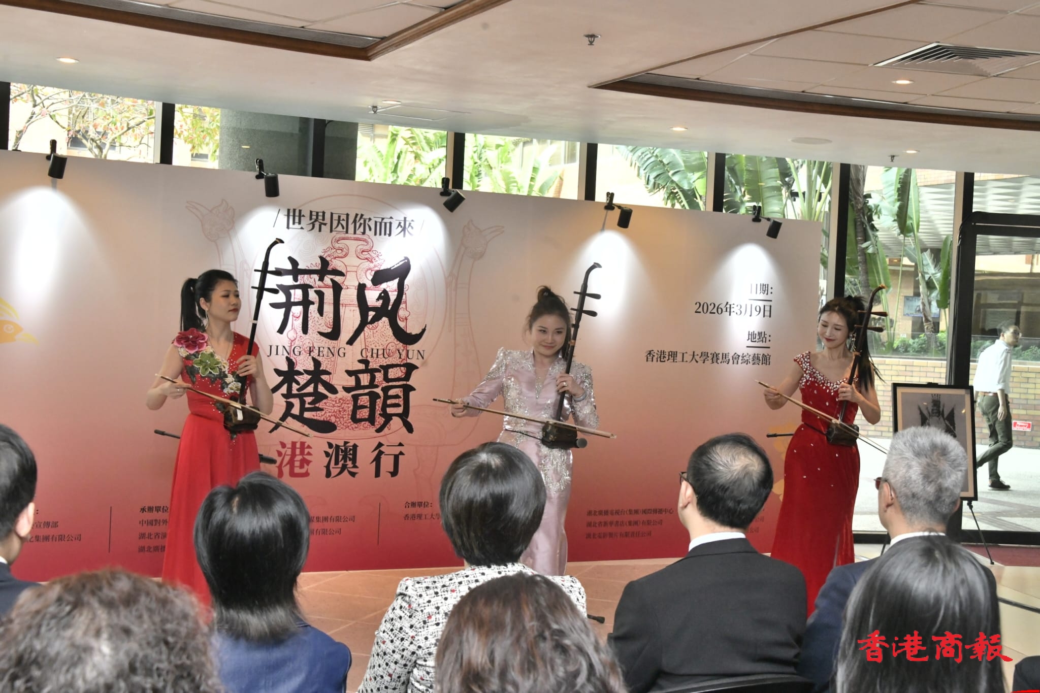 香港理工大學協理校長羅璇致辭,衷心感謝大家把這場藝術盛宴放在理工大學,把編鐘、湖北文化和香港大學生、香港的年輕人連接在一起,是理工大學的榮幸。至於文化交流是必不可分,是大學一個重要里程碑,非常感謝主辦單位誠意送贈《荊楚文庫》相關的書本予理工大學,書本贈予體現深厚的文化情誼,也是對教育文化傳承之支持。通過這次活動充分領略到湖北傳統文化藝術的魅力 ,她更相信稍後的音樂會一定會為大家帶來震撼心靈的藝術享受。