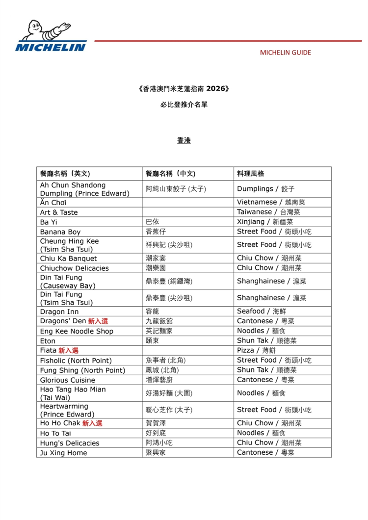 入選必比登推介名單的食肆,均以實惠的價格為客人帶來「物有所值」的美食體驗。今年香港共有70間食肆入選必比登推介名單,其中6間為新上榜。香港新聞網為大家整理出70間食肆名稱,並介紹了新入選的6間食肆的特色。