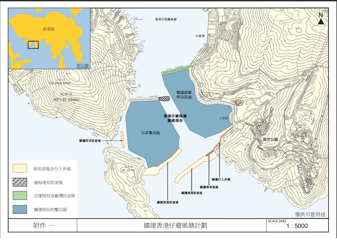 避風塘擴建工程,政府目標在本年第二季向立法會提交撥款建議並展開工程,擴建面積約24公頃,目標於2030年完成。其時布廠灣防波堤(長300米)將作公共休憩空間,由未來的發展商負責管理及維護,並於合理時間內開放予公眾使用,而新建的東面防波堤(長340米)上設置公共休憩空間及公眾登岸設施,並會加建行人步道連接至海洋公園水上樂園旁的海濱長廊一帶,擬交由海洋公園管理,會免費開放給公眾。