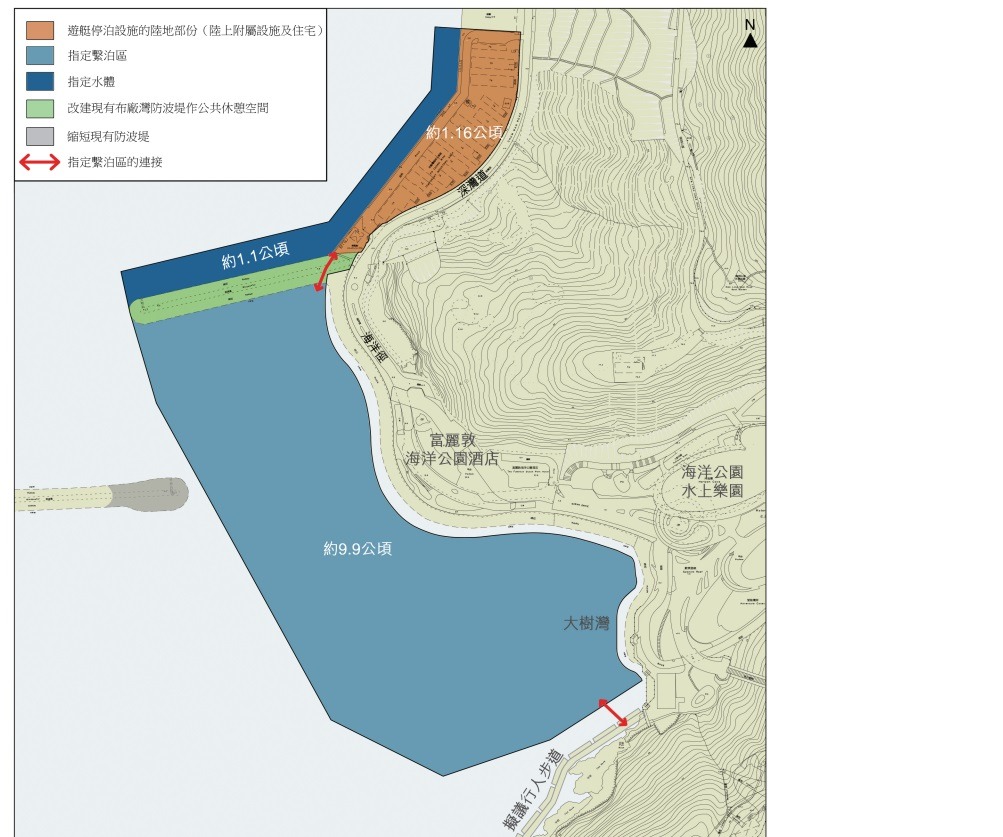 局方去年共收到8份意向書,包括海外內的遊艇會或發展商(包括附近的深灣遊艇會),經市場意見調整和顧問評估後遊艇停泊位佔約11公頃水體,約200艘長50米或以下的遊艇。至於約1.16公頃的布廠灣臨時工業區及「乘風航」用地,除用以提供遊艇陸上附屬設施(包括會所、餐飲、遊艇補給、基本修理、停車場、健身中心、多用途室等),將加入私人住宅元素,以提升項目財務可行性及更好釋放土地潛力。