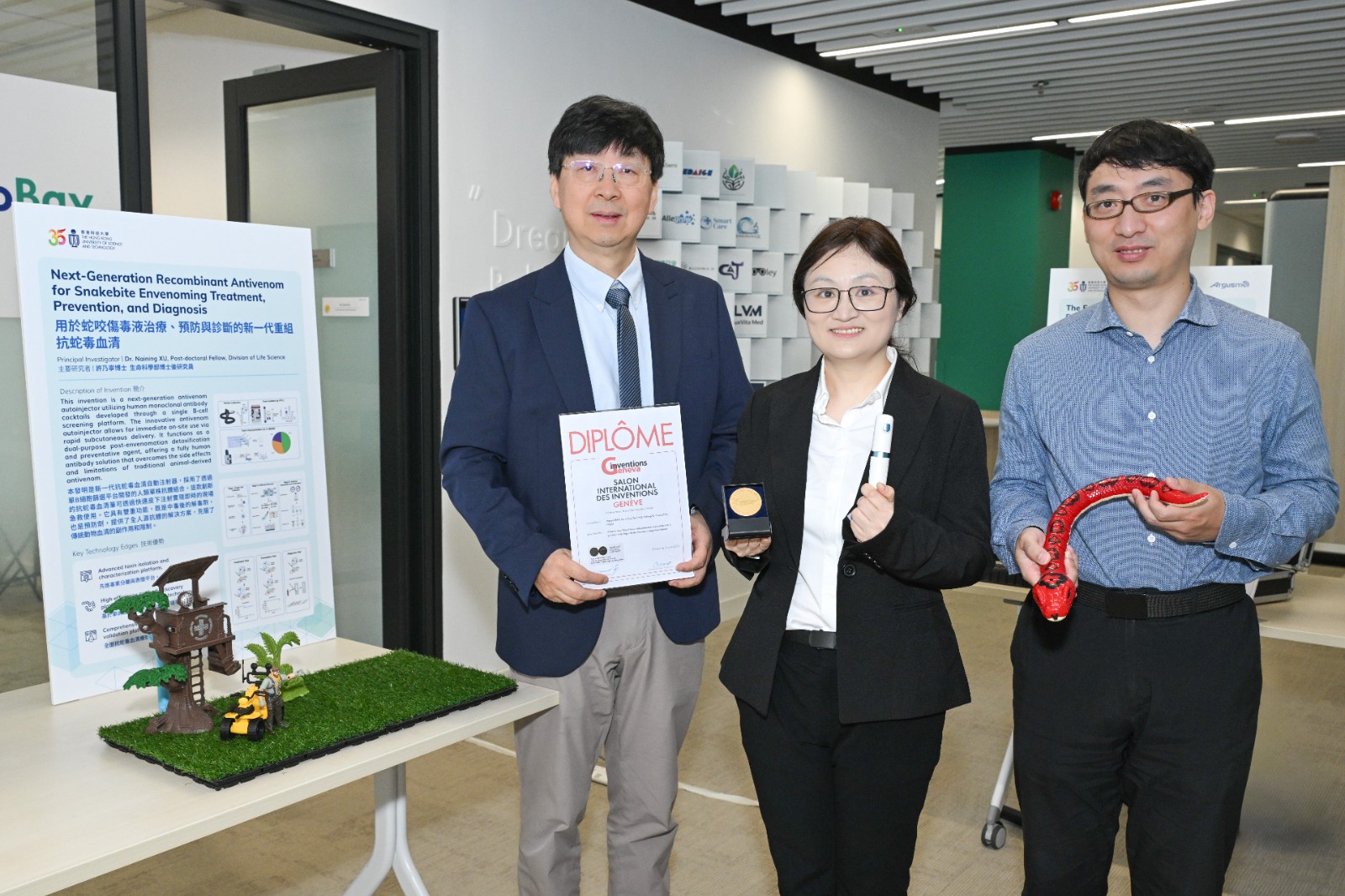 據世界衞生組織估算,全球每年約有 540 萬人被蛇咬傷,其中不少會出現中毒反應,造成約 8.1 萬至 13.8 萬人死亡;在香港,中毒控制中心亦在 2021 至 2023 年間錄得近 300 宗蛇咬求診個案。傳統抗蛇毒血清須將蛇毒注入馬、羊等大型動物體內以刺激其產生抗體,再從血液中提取製成,過程不但成本高昂,亦可能引致過敏反應。團隊研發的新一代抗蛇毒血清注射筆,透過先進抗體開發技術B細胞篩選平台,開發人類單株抗體組合,能大幅減低人類對血清的過敏反應。此工具輕巧易用,遇到緊急蛇咬情況時,一按即可注射,有助爭取黃金解毒時間。
