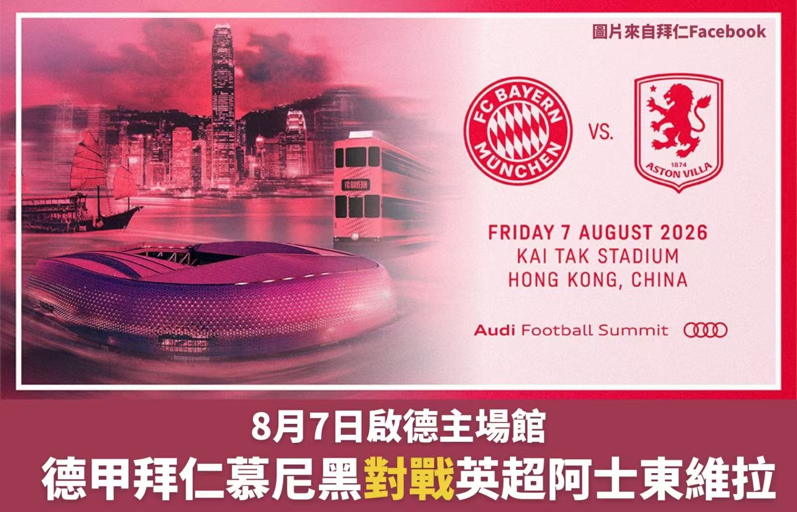 繼上年暑假舉行「香港足球盛會2025」之後,香港今夏再有足球盛宴,「2026年奧迪足球峰會」將於8月7日(周五)在啟德主場館舉行,由德甲班霸拜仁慕尼黑對戰英超勁旅阿士東維拉,有關購票詳情及公開訓練課等安排,將於稍後公布。