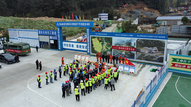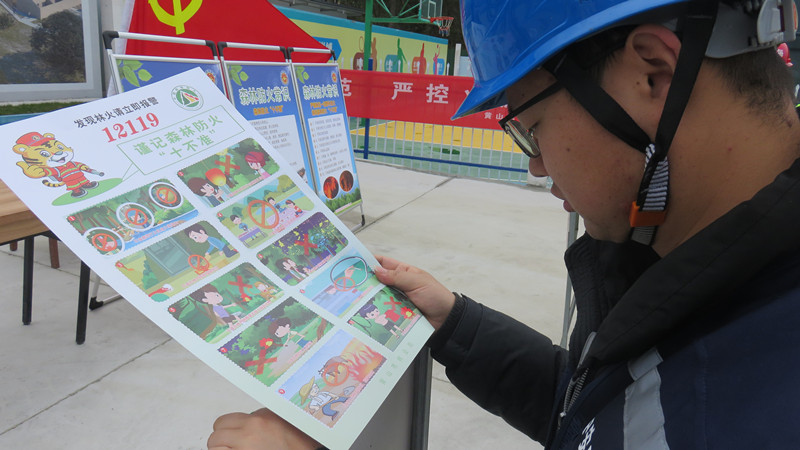 「清明節就要到了,切記不要攜帶火源進山、進林。」「大家看,我們這個裝備叫風力滅火機,它的原理是強風切割火焰底部,讓火焰與可燃物分離,達到快速滅火的目的……」來到位於譚家橋鎮的黃山風景名勝區雲谷索道下半段建設項目施工現場,10名森林消防員正熱情地為工友展示風力滅火器、砍刀等滅火工具與設備,並逐一講解原理及使用方法,同時,發放「謹記森林防火『十不准』」等宣傳單向大家普及森林防滅火的重要意義和相關安全常識,引導群眾自覺遵守森林防火的有關法律法規,共同樹牢森林防火的自覺意識。