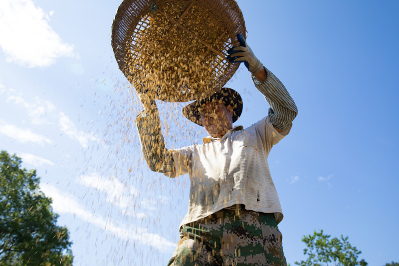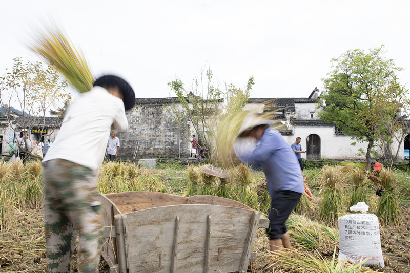 春種一粒栗,秋收萬顆子。金秋時節,豐收季節。在安徽省黃山市黟縣西遞村後邊溪的稻田裡,金黃遍野,稻米飄香,充滿豐收的喜慶景象。眼下,黟縣水稻進入收割季,稻田裡滿是農民搶收糧食的身影,他們揮灑汗水,奏響了農業增產增效的「豐收曲」。 (記者 吳敏 通訊員 汪澄)
