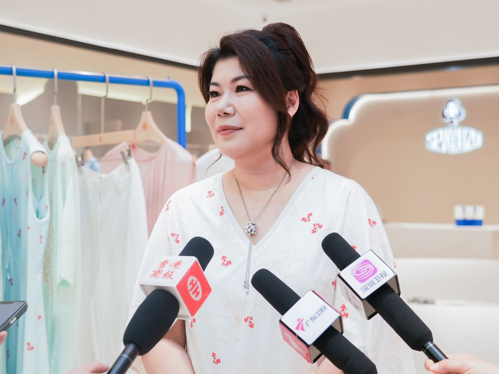 深圳雅元時尚集團有限公司主理人羅姿Erin則從消費者角度表達了興奮之情:「一走進店鋪就能感受到愉悅、陽光的能量場。」她當場選購併換上一套「聲雨竹苗」服飾,以米杏色針織背心搭配米色緞面長裙,用自身體驗盛讚其用料與質感:「譬如我身上這條裙子,是百分之百桑蠶絲材質,觸感如蛋白般絲滑,上身效果和舒適度都可媲美奢侈品。」