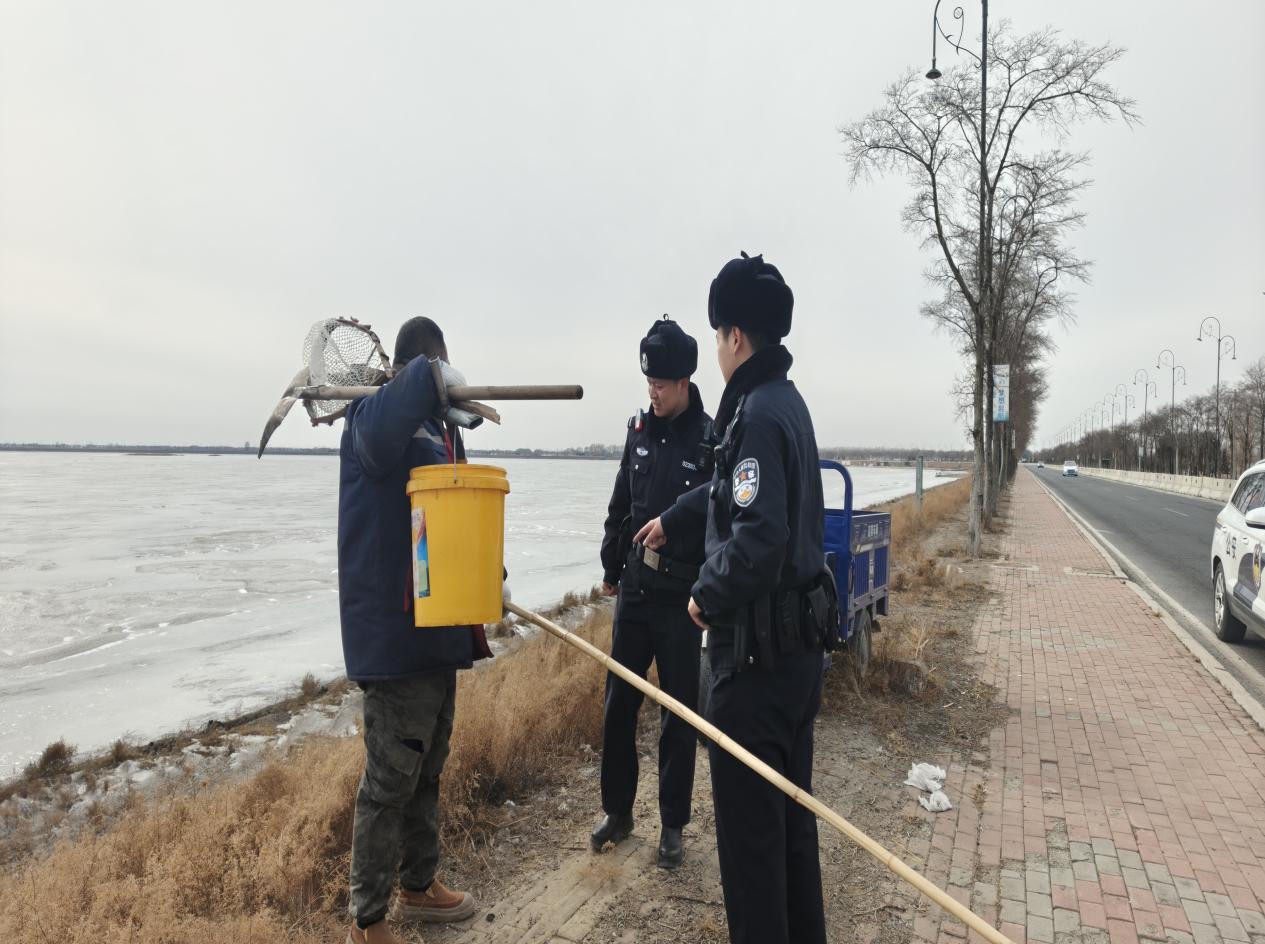 巡邏過程中,民警沿着江岸逐段巡查,通過文明勸導、溫情提醒的方式,對附近群眾開展冰上安全宣傳教育,用真實案例敲響安全警鐘,耐心勸導仍在冰面上垂釣、逗留、玩耍的群眾,細緻介紹當前冰面危險狀況,不斷提升群眾安全防範意識。