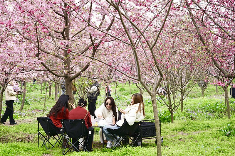 近年來,文永村的百畝桃林已成為不少市民和遊客的好去處。儘管綿綿春雨,但依舊擋不住大家踏青賞花的熱情。雨霧中的桃林既有詩意朦朧,又有煙火熱鬧,粉白花瓣綴滿枝頭,沾着晶瑩雨珠,更顯嬌嫩欲滴。撐傘漫步在心形桃花廊道,煙雨朦朧與花海爛漫交織成一幅絕美的春日畫卷,遊人或牽手漫步、駐足拍照,或沉浸式參與各項特色活動,歡聲笑語在桃林間久久迴蕩。