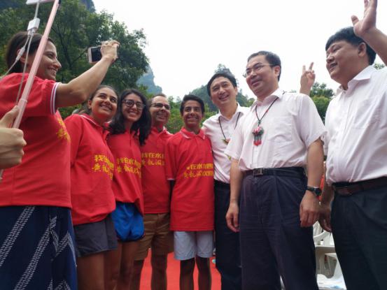 活動現場,張家界市委副書記劉革安(右二)、張家界市人民政府副市長歐陽斌(右三)與國際網紅互動