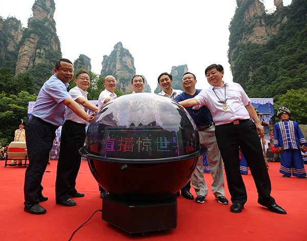 張家界市委副書記劉革安(中),張家界市人民政府副市長歐陽斌(右三)、李培其(左三)等領導共同觸摸啟動球