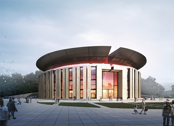 在发布会现场,剧场EPC总包单位——中国京冶对演艺剧场进行了设计演示,整个剧场设计确立了室内外并存观演的方式,提炼了项目文化“火主题”,从神话时代对于“火”的崇拜,由神话故事中南方神鸟——朱雀从远方衔来了原始的火种,提出祝融剧场造型的核心理念——承载保护着圣火火种的容器,并在立面方案上进行演绎:当代表着先民图腾崇拜的巨石阵,充满力量般地向上托举起“火种”的象征时,奠定了“高举”火种圣火容器的地位,至此祝融剧场与远处天子山坛庙“遥相呼应,相得益彰”。总体设计理念上整合“负阴而抱阳”的整体环境观,景观元素归纳为“日月同辉”,为国内首创。室内1200座,室外800座,总计容纳约2000人,在国家室内剧场设计规划中已明确,室内座位1200座及以上为大型剧场。天子山祝融剧场的建设,将填补湖南省衡阳市在大型室内剧场上的空白。