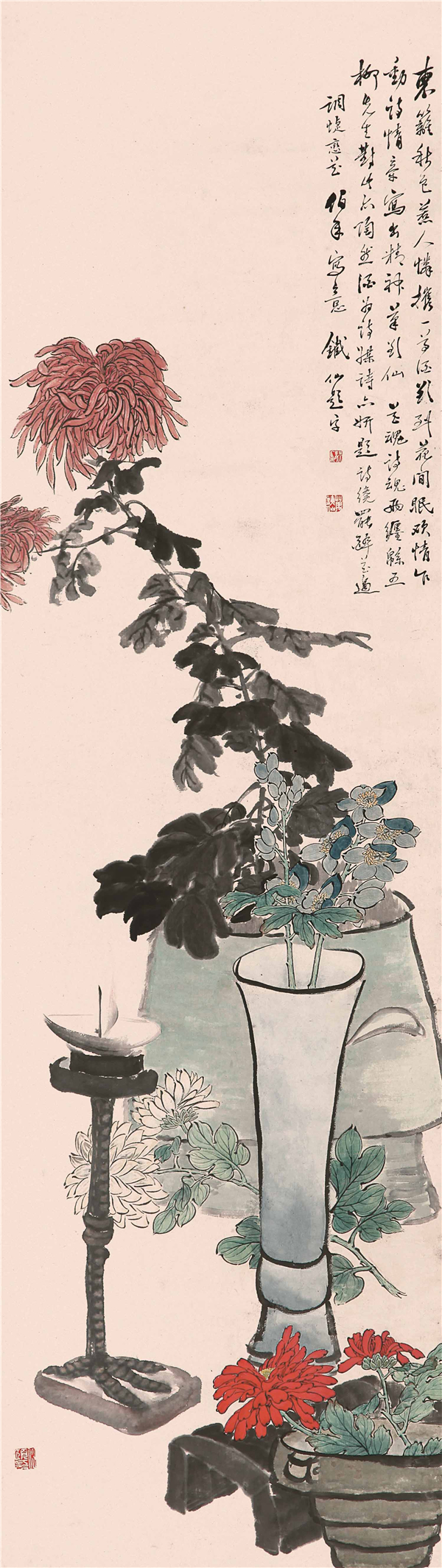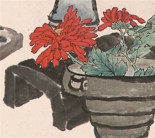 任伯年重視繼承傳統,融匯諸家之長,並吸收西畫的速寫、設色諸法,形成自己豐姿多彩、新穎生動的獨特畫風。整幅畫構圖巧妙,形與形互相呼應,色與色互相襯托,清幽脫俗。南山之菊,以雙钩繪之,同時借鑒了西畫光影背向的敷色效果,色彩在深淺、濃淡、冷暖等對比中保持和諧統一,豔而不俗。盆植之紅菊,如美人雖蓬頭亂髮而不掩國色,在石青古缶盆與水墨葉子映襯下,更顯意蘊豐厚。右下角雖同為紅菊,其色鮮豔如火,不同於左上角所用的朱砂、胭脂,而是引入西洋紅,兩種紅菊互相呼應,相得益彰。加上橫擺之白菊,瓶插之藍菊,四種不同菊花,將中國畫之筆意墨韻與設色用水的精髓發揮得淋漓盡致,妍麗悅目,濃而雅馨。畫中漢雁足燈,造型準確,曲盡其態,以寥寥數筆寫出燈盤,灑脫傳神,又較具象地表現雁腿形柄,膝部和足蹼,刻畫細緻逼真,雅趣古樸。整個畫面充滿了詩的意境,看似自然平易,其實千錘百煉,功力盡顯。
