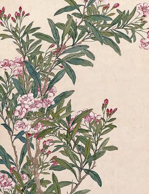 《春花爛漫》是張莘花卉作品的尚佳之作,用筆精緻細膩,設色秀麗清雅。觀此畫,似有陣陣清新花香撲鼻而來。此畫構圖飽滿,錯落有致。夾竹桃取其已開、將開未開及花苞各態,點掇並用;葉子的正背面以不同主色表現,水色淋漓,有飽含春澤之感。畫面色彩極為豐富,層次清晰而富韻律感。
