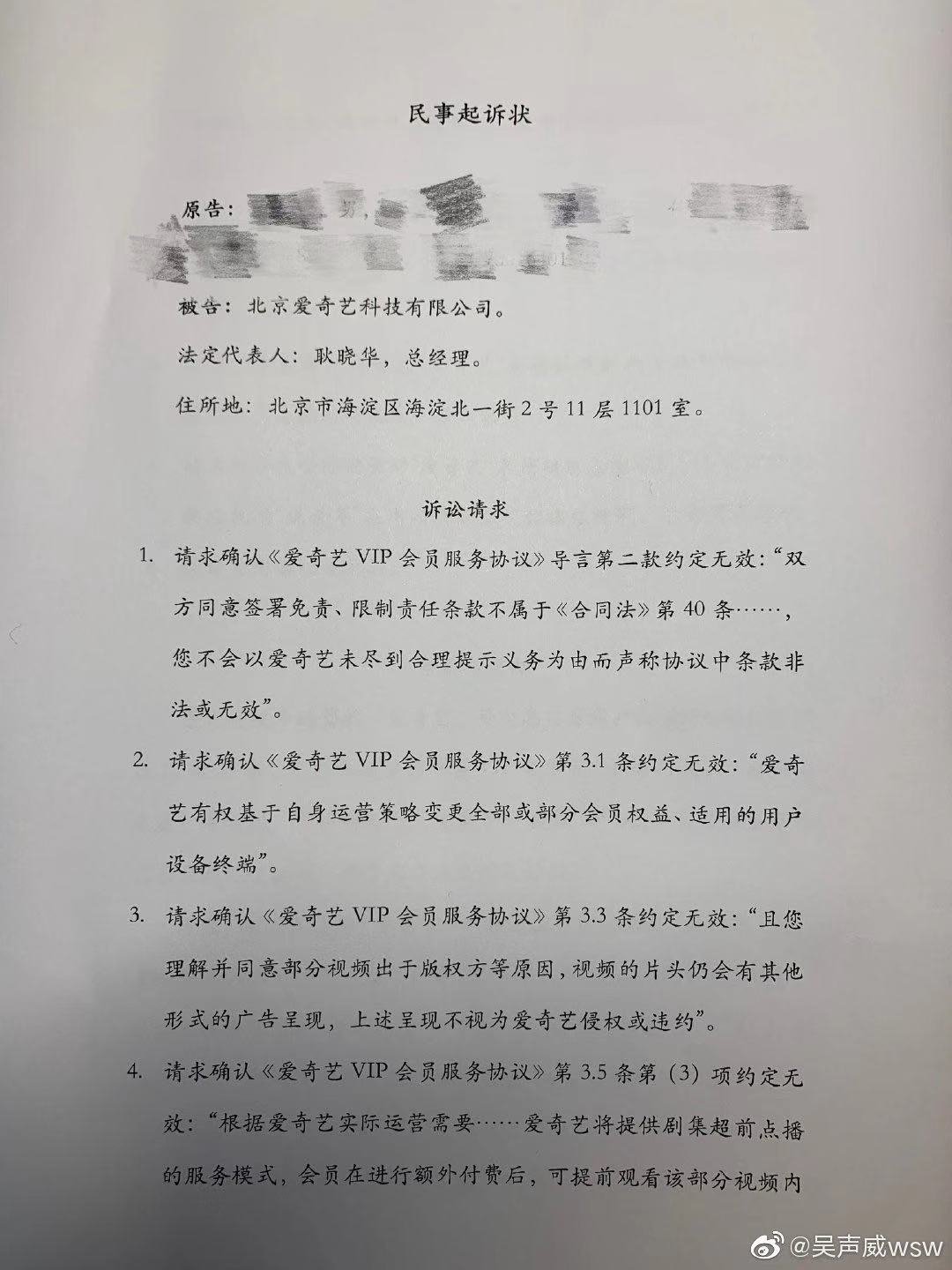 起诉书中提及,爱奇艺会员用户协议中多处存在格式合同,违法了公平原则,侵犯消费者权益应属无效。起诉状中,他请求法院确认《爱奇艺VIP会员服务协议》导言第二款、第3.1条、第3.3条、第3.5条第(3)项、第10.2条规定无效。