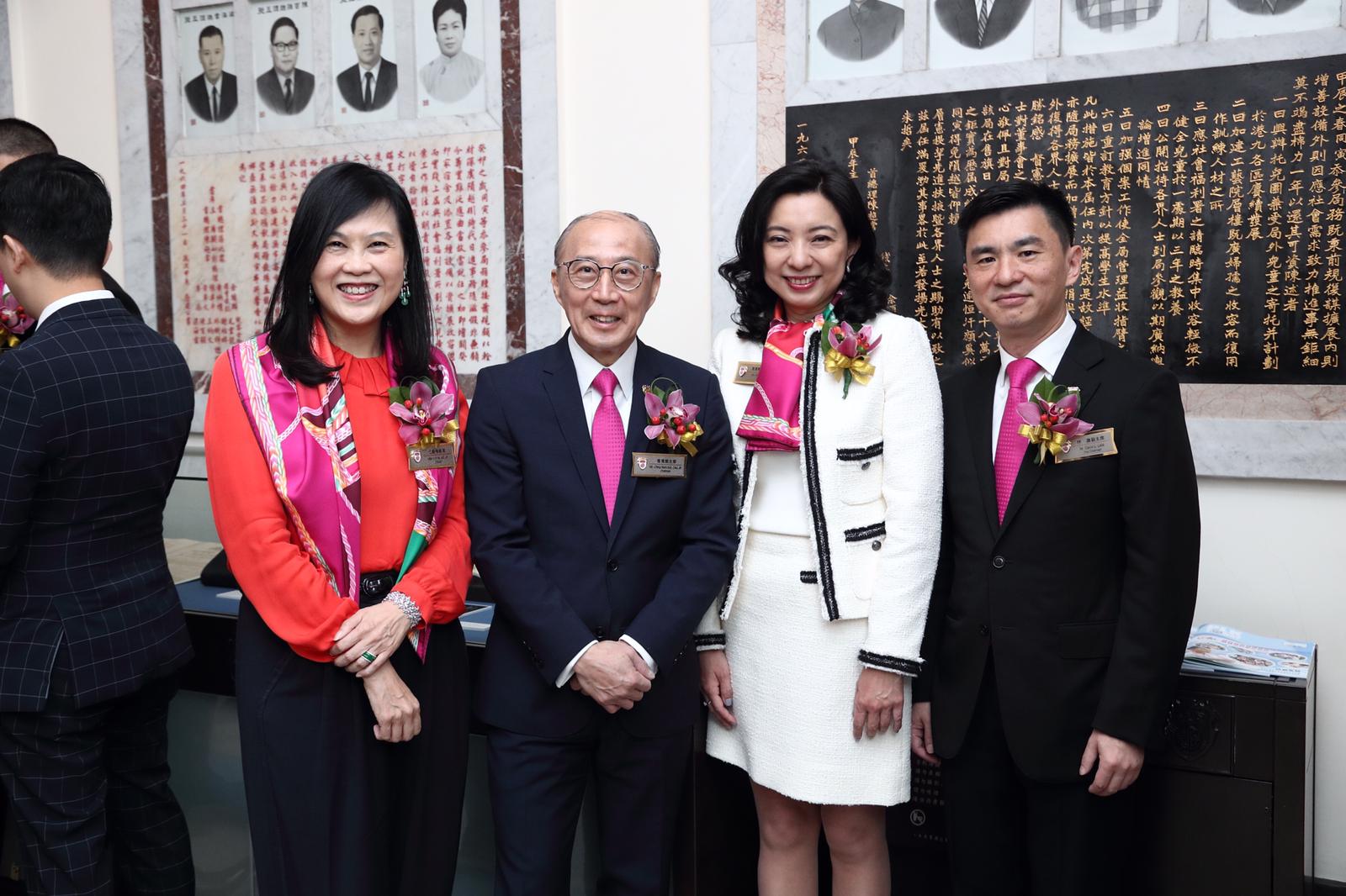 保良局活動就職典禮日。左起:伍穎梅、保良局主席馬清楠伉儷、保良局副主席林潞。