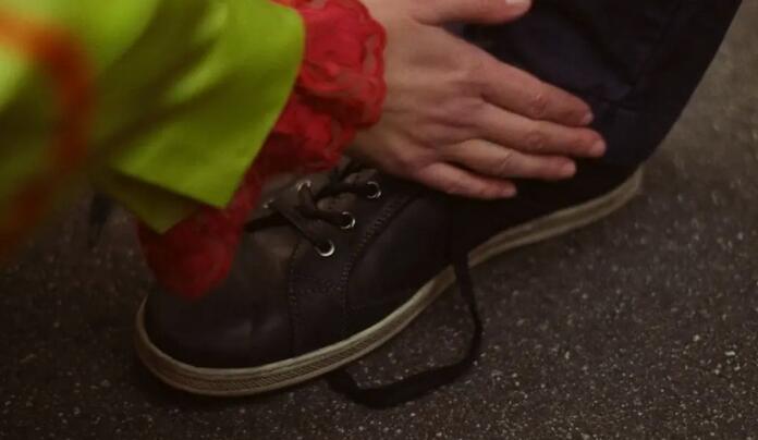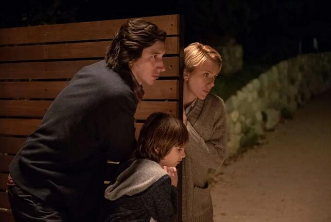 《婚姻故事》剧照。电影结尾,妮可看到抱着他们儿子的查理鞋带松了,便喊住他蹲下身给他系了鞋带,随后轻轻拍了拍查理。
