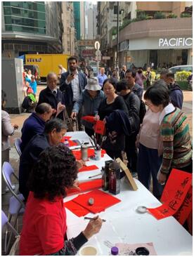 【香港商报网讯】在農曆新年前夕,2020年1月9-11日,香港中華文化總會一連三天在香港中區舉行了由二十多位屬會藝術家組成的《書法藝術工作坊》,深入社區舉辦“迎新春佳節,寫揮春贈送文化進基層”活動,吸引大批社區市民及上班族前來領取合適的揮春。 “龍馬精神”“出入平安”“春”“福”“龍”“福壽祿”“吉祥如意”等吉祥揮春深受各階層市民群眾的喜愛,外國來港的旅客也駐足欣賞,不停地拍照留影。