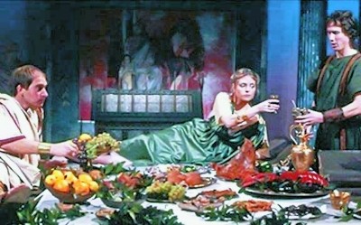 最开始的罗马人习惯坐在桌边吃饭,但从公元前4世纪起,受希腊人的影响,斜躺着吃饭成了罗马贵族身份地位的象征。用餐时,身份最低者站立一旁,高一级的坐着吃饭,最高级别则可以斜躺着被服侍用餐。配合斜卧姿势的卧榻一般在同一间屋子里会摆设三张,每张大小可以容纳三人。三张卧榻以马蹄形放置,餐桌就摆在马蹄形的中央,确保头朝桌子斜躺的用餐者右手可拿到食物(此时刀叉等餐具还没有出现,取食主要用勺子或手)。对于躺着用餐的人来说,不仅他们的位置不分餐,食物也是大家一起共享,这样的用餐模式毫无疑问是彻底的“合餐”。罗马宴请的风俗特点在东方文化看来成何体统,但躺着吃饭也有自己的一套“用餐礼仪”,躺卧的位置有尊卑之分,赴宴必须衣着托加(罗马长袍)以示对主人的尊重,有时在宴会中途还要更换一次托加。