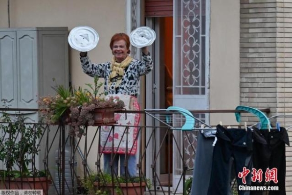 意大利罗马,一位居民用锅盖敲钹,参加名为“从窗户往外看,我的罗马”(Look out from the window, Rome mine !)的音乐快闪活动。