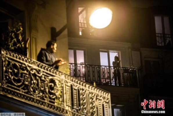 法国巴黎,在阳台上的居民与与法国各地的民众一起鼓掌向医护人员表示支持。