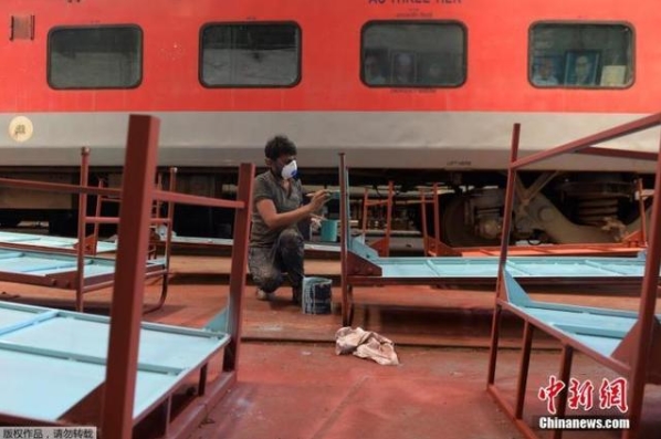 3月30日,印度陈奈,工人们正在加紧准备隔离病房中的病床。