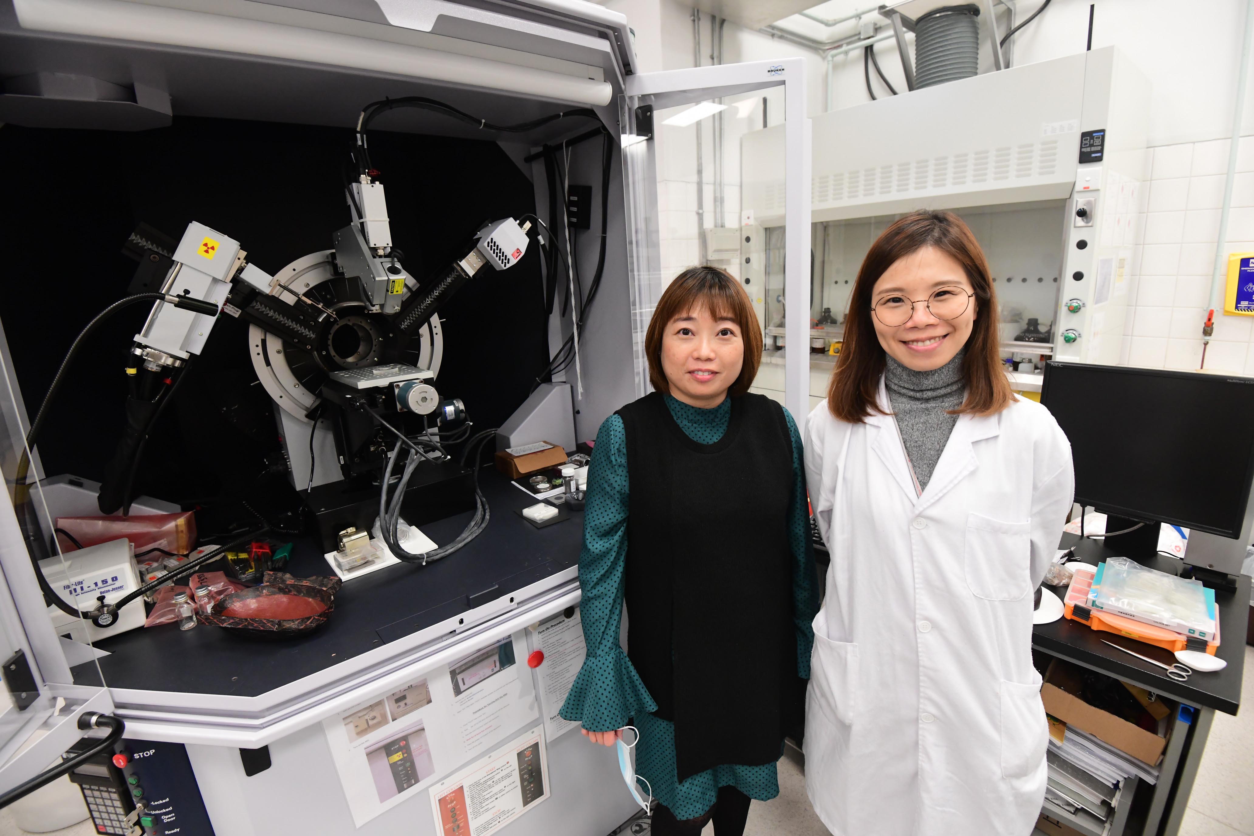 鄧汶慧(左)及甘婉君(右)向記者介紹修復用的儀器。「X射線衍射儀」(圖左),可用於繪畫及多色雕塑上的顏料分析、金屬的腐蝕過程等檢測。