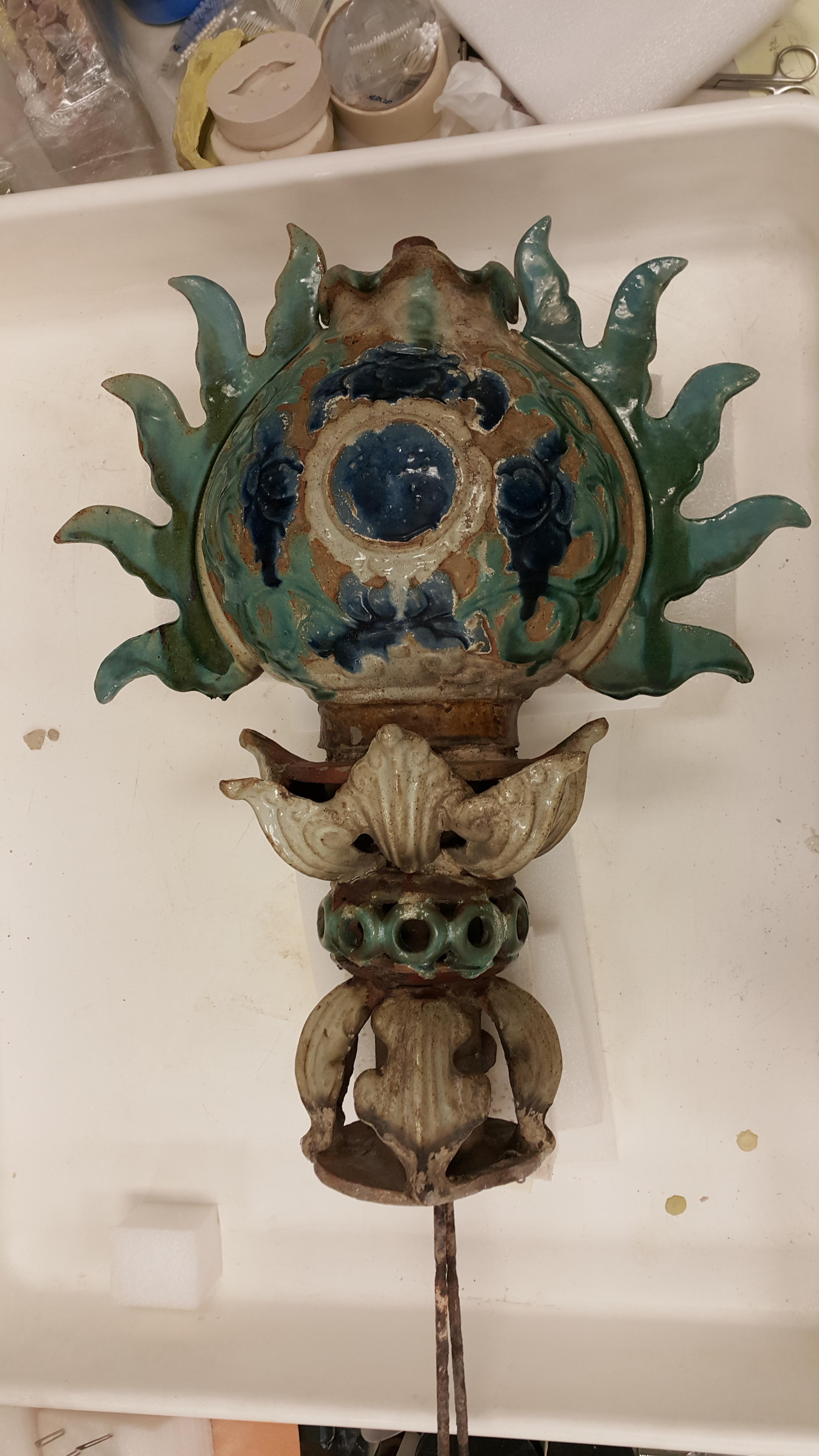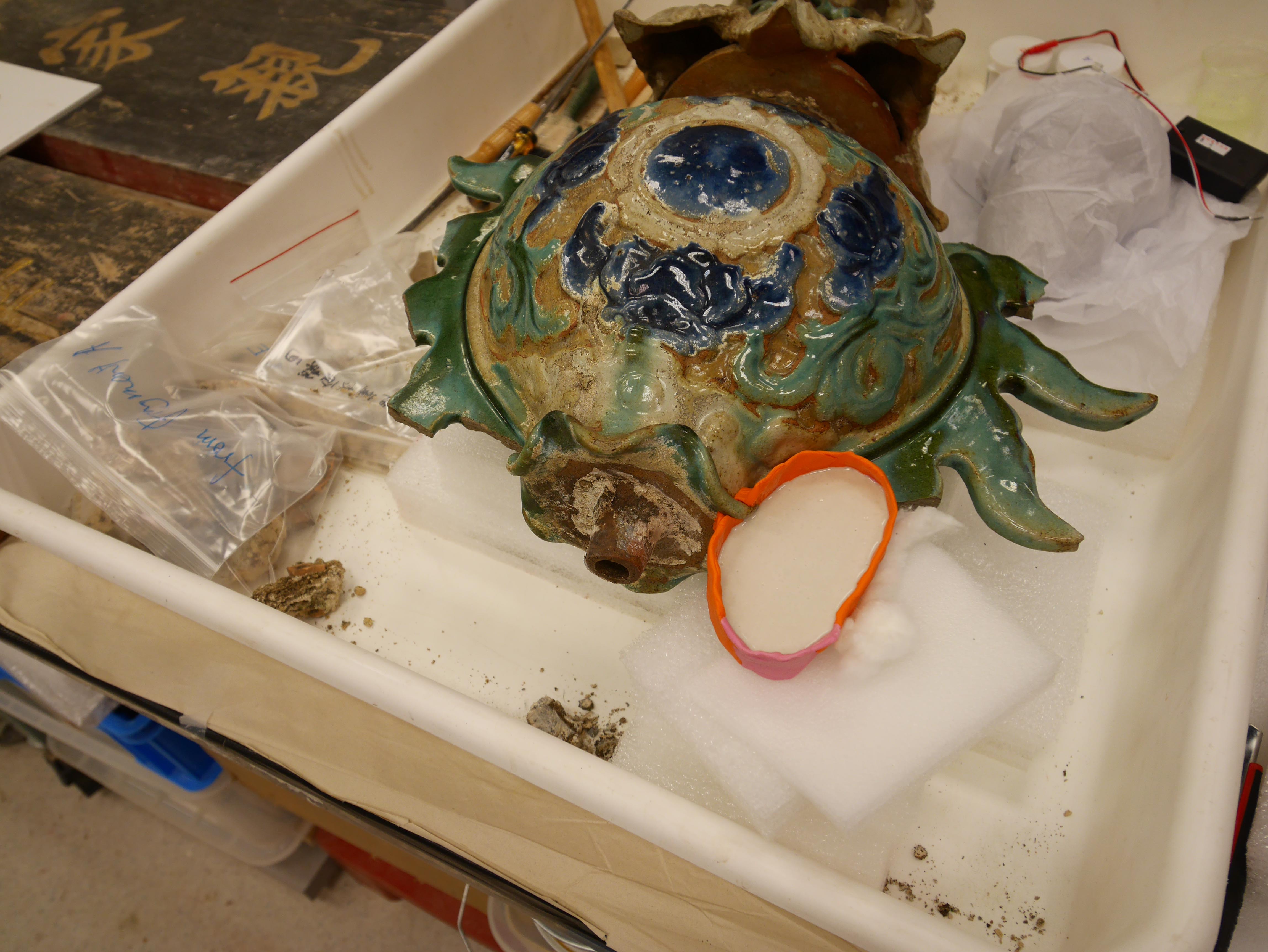 這件文物為香港法定古蹟達德公所屋頂上的陶瓷「龍珠」,原本破爛缺失,經甘婉君採用倒模的方法填補,並用經測試適用於陶瓷修復的環氧樹脂膠水黏合,再用礦物顏料復原本身胎、釉的顏色,成功還原。
