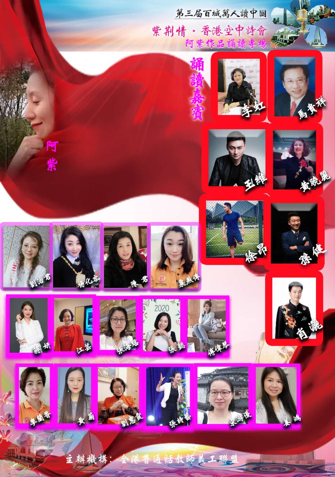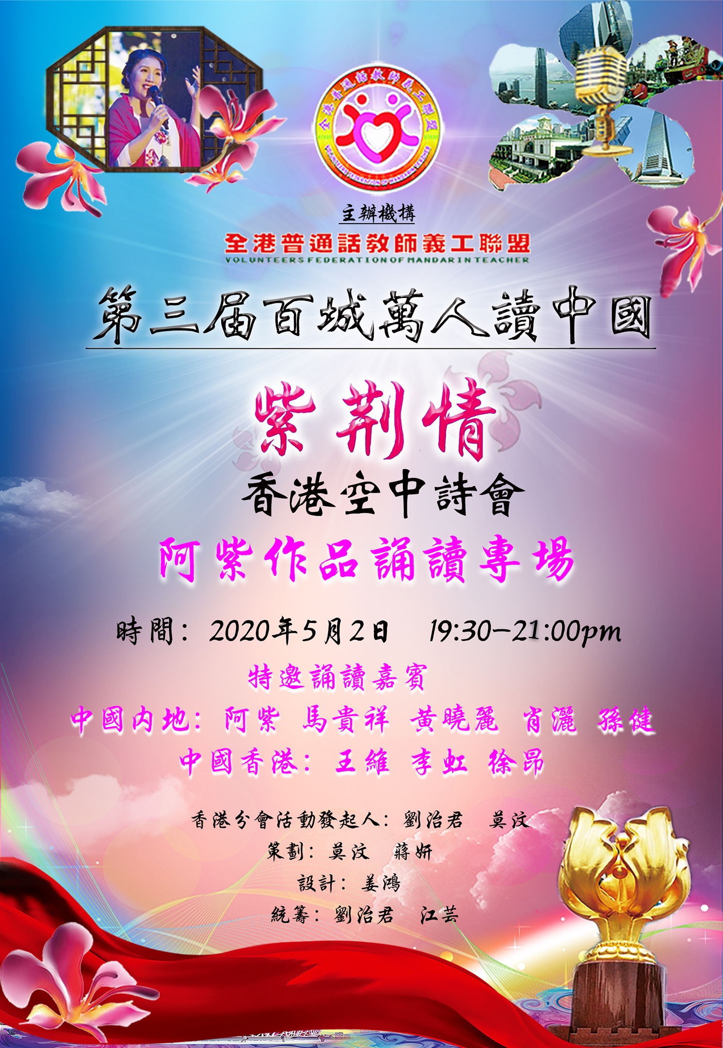 2020年5月2日晚,第三屆百城萬人讀中國"紫荊情"香港空中詩會阿紫作品誦讀專場於7:30準時拉開序幕,並於9:00圓滿落幕。本次空中詩會線上誦讀活動由全港普通話教師義工聯盟主辦。活動以誦讀中國當代著名詩人阿紫的詩歌作品為主題,集結了中國內地、中國香港等多位知名的朗誦專家及全港普通話教師義工聯盟的會員老師共同參與,協力打造。