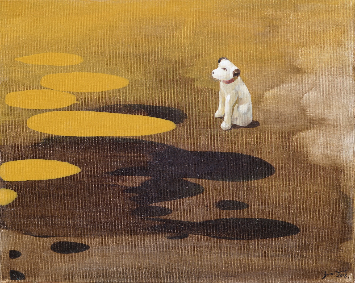 廖井梅作品《Nipper的暇想》。除了寫人體和風景,廖氏還有充滿童趣的作品。該作品以小狗為「主角」,寫實地描繪小狗的蹲姿,背景則由不同色塊組成,虛實相融。
