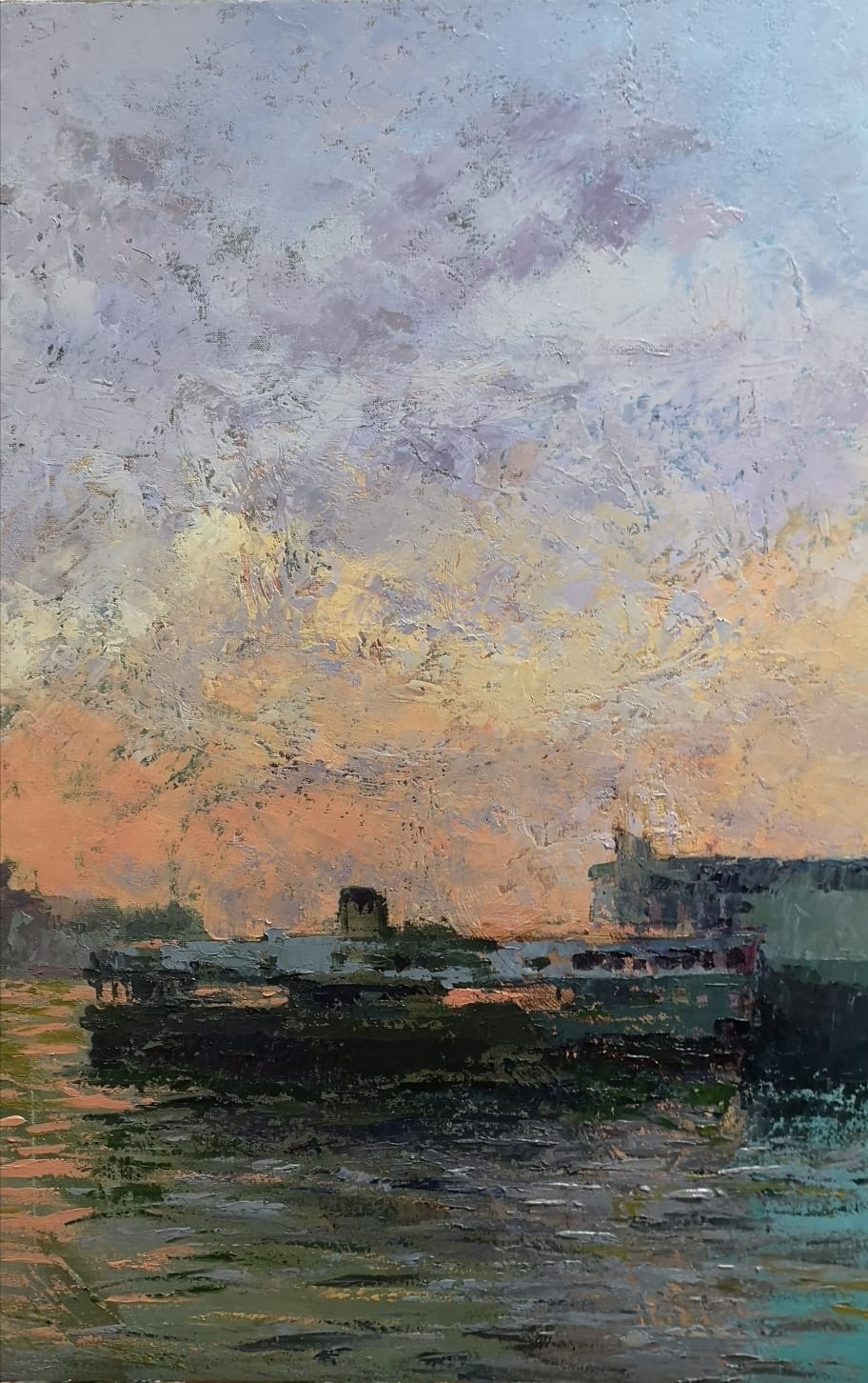 廖井梅作品《夕陽渡》。80×70cm。(馮瀚文攝)