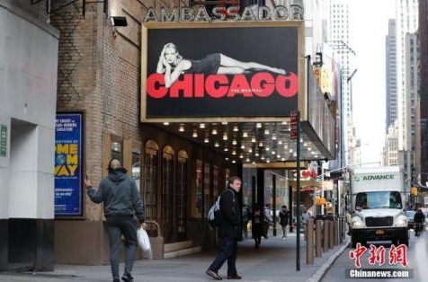 美国纽约百老汇,有人走过关闭的剧院。 中新网 图
