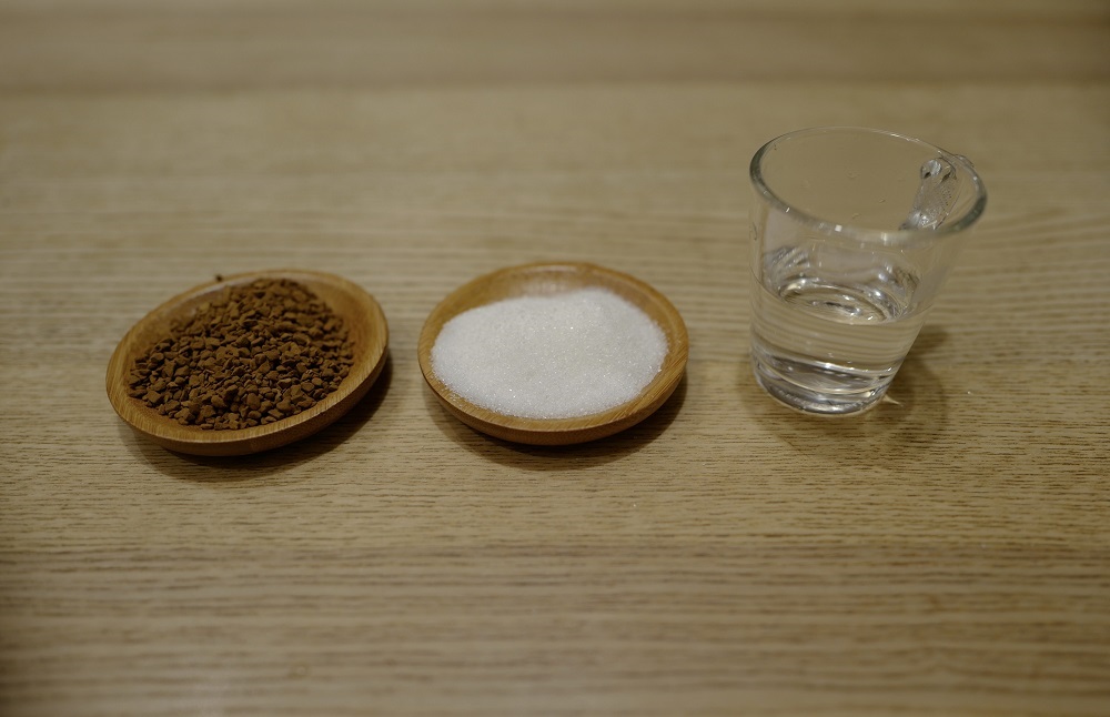 1.在打發盆裏加入各2大匙的即溶咖啡、砂糖、熱水;