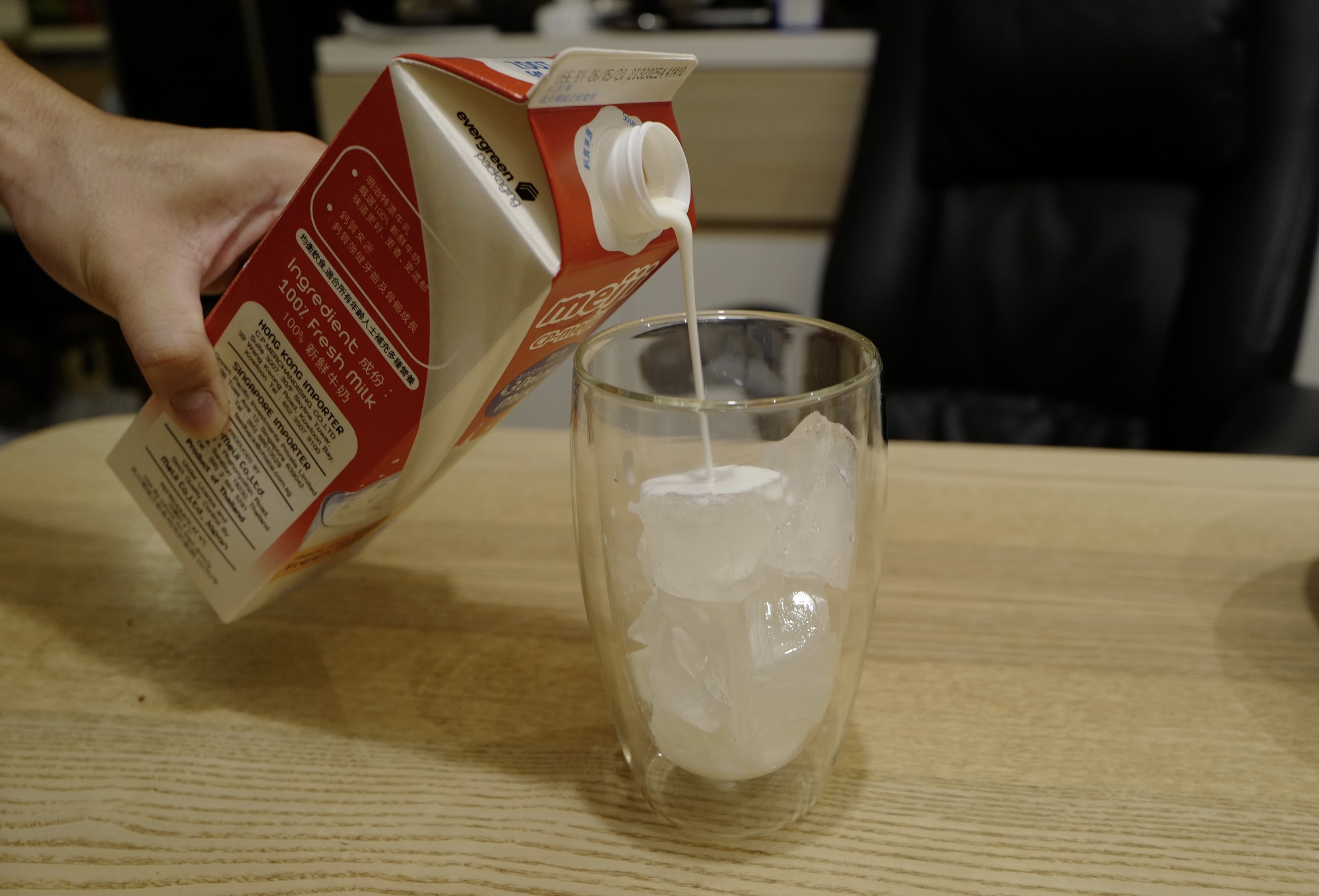 4.在玻璃杯裏放入3/4杯的冰塊,再倒入冰牛奶;