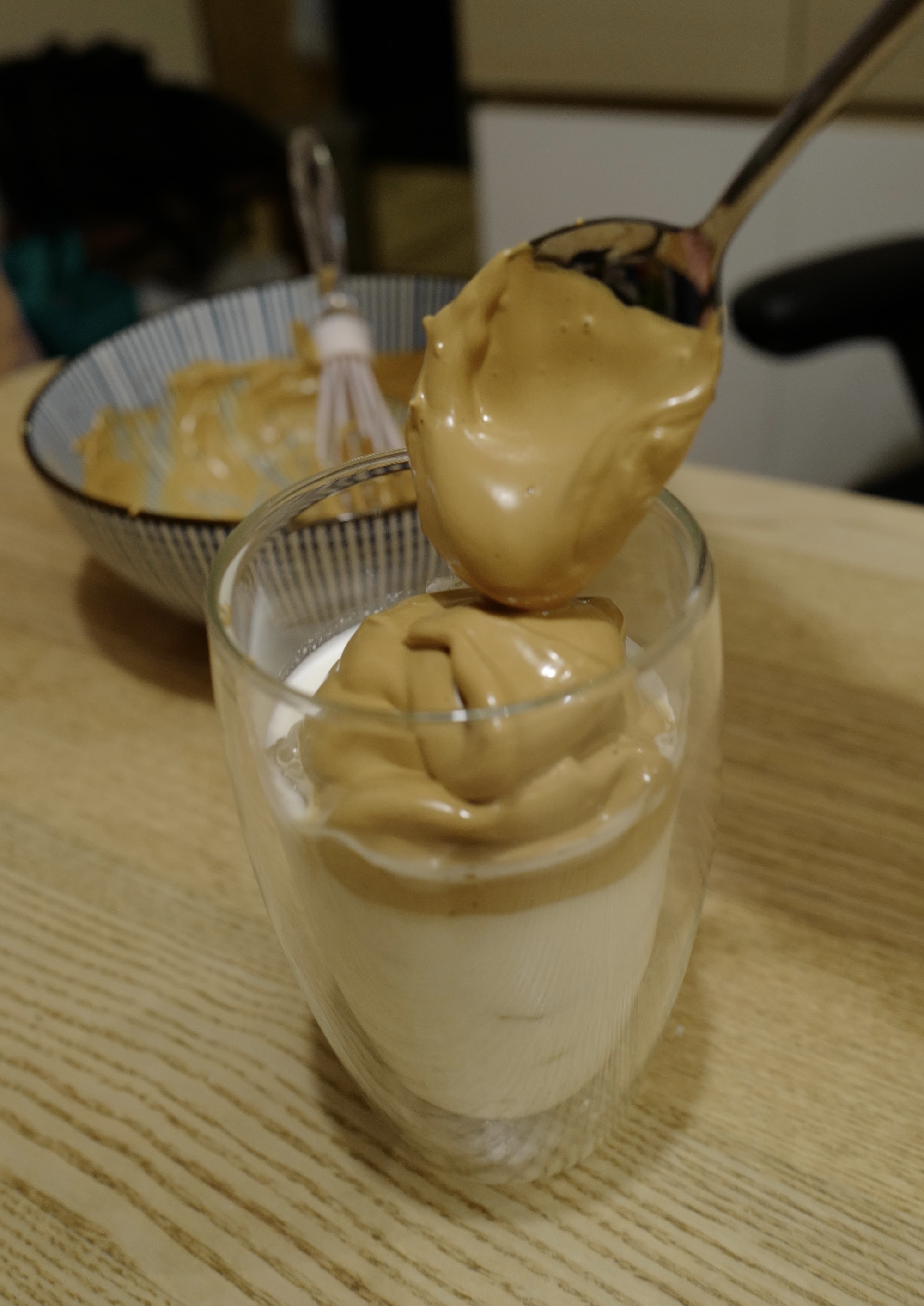 筆者作為咖啡迷,每朝起身飲一杯醒神,已是日常生活中指定動作。這杯名為「400次咖啡」(Dalgona Coffee)起源於韓國,其實就是焦糖奶蓋咖啡。因為韓國綜藝節目《新品上市便利餐廳》在澳門拍攝外景時,偶然發現了一間茶餐廳老店招牌的手打咖啡,老闆在杯中加入咖啡粉、糖及熱水,瘋狂攪拌400次,直到攪拌出如同雲朵般的綿密泡沫,最好倒入加了冰塊的牛奶即成。隨着節目播出,讓這款暱稱為「400次咖啡」瞬間在韓國爆紅。加上疫情大家減少出門的期間,這股DIY熱潮很快便蔓延至全球各地,就此一炮而紅。