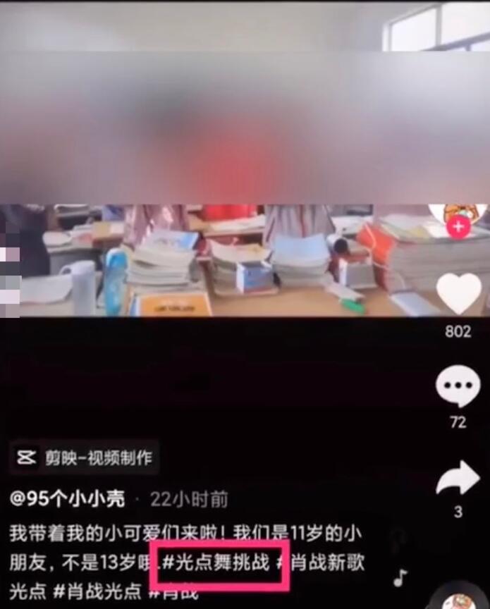 画面中,一群身穿校服的孩子在教室一齐呼喊:“肖战哥哥你很好,我们很喜欢,冲啊!”该视频下方配文称,“三年级的小朋友来挑战啦!”还带上了话题标签“肖战新歌光点”“光点舞挑战”等。有网友指出,此为江苏省宿迁市沭阳一学校教师在组织学生为自己的偶像应援。