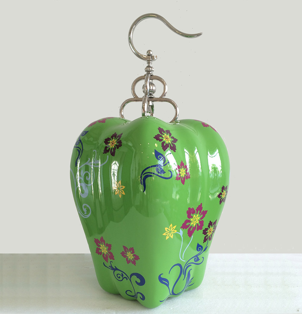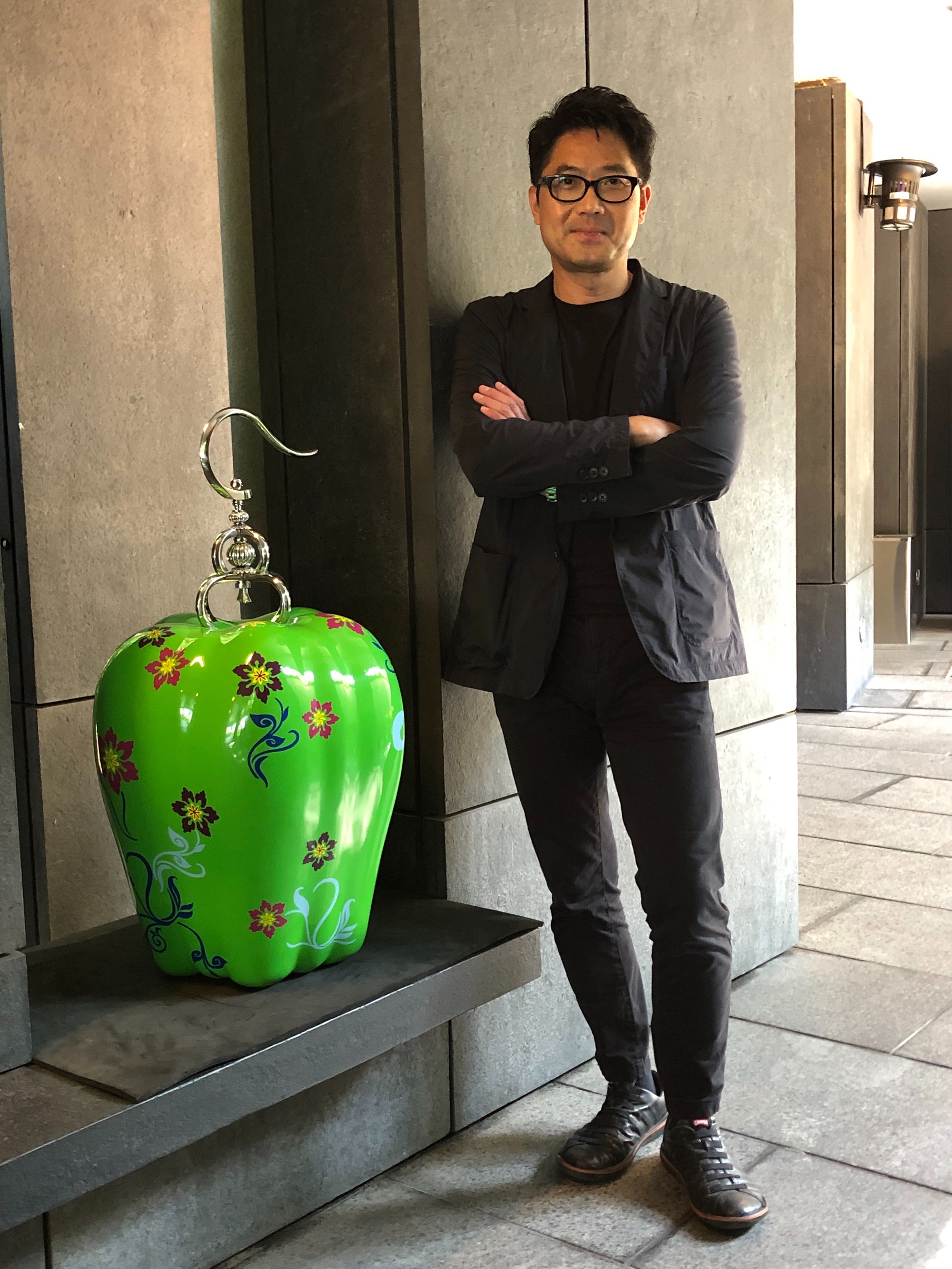 甘志強與作品《蘋果花花 3》, 現正展出於亞洲協會香港中心雕塑聯展,展期至9月27日。