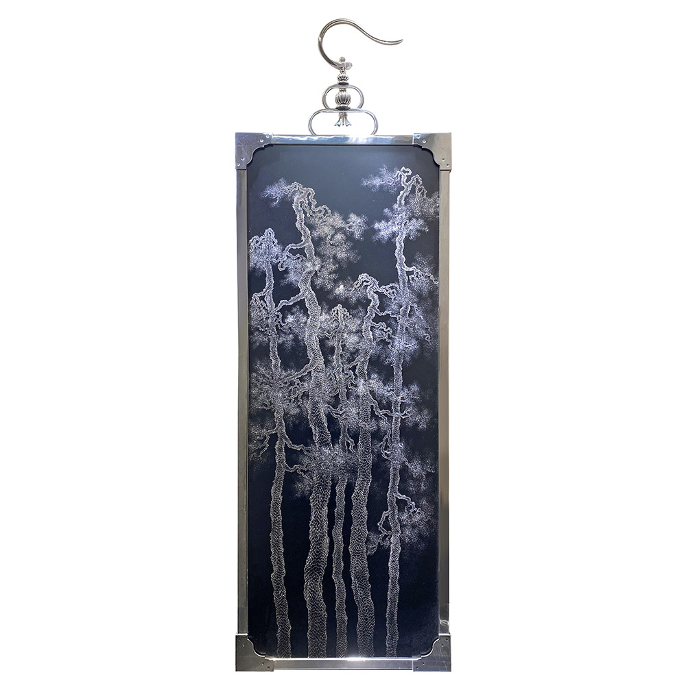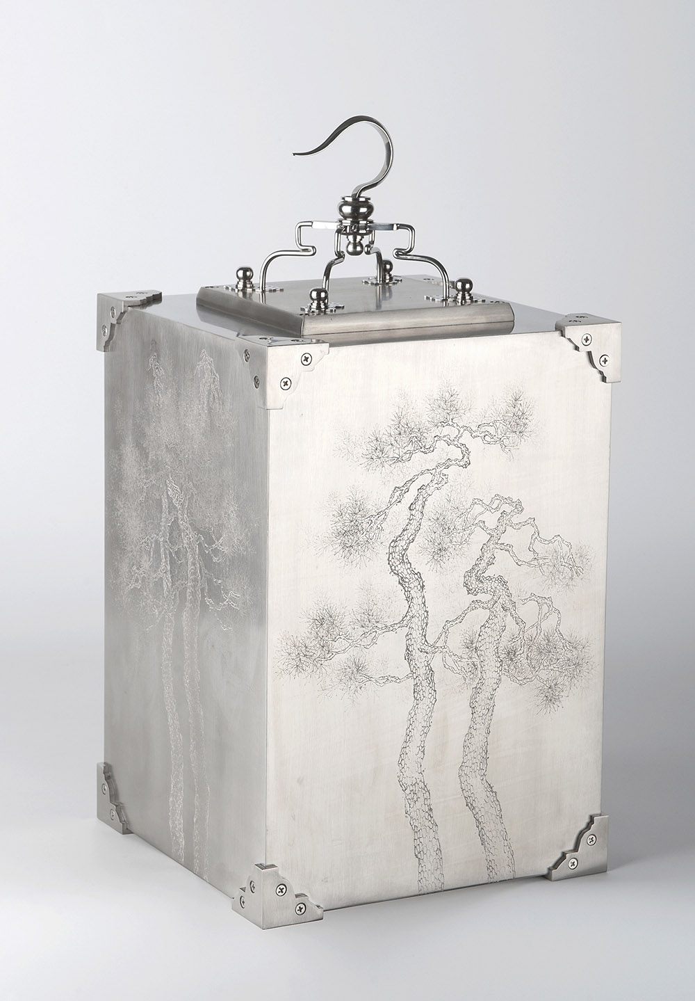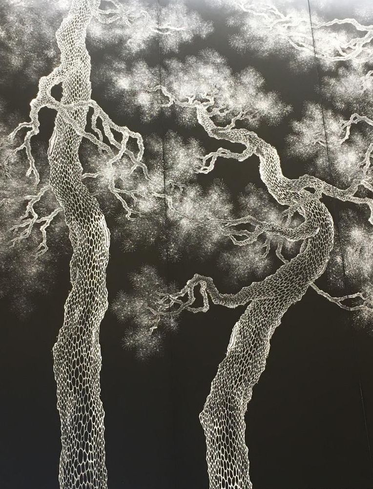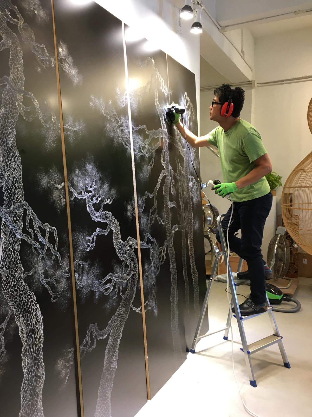 藝術家用電筆細致地刻畫出鱗狀的松樹紋,在燈光照射下熠熠生輝。