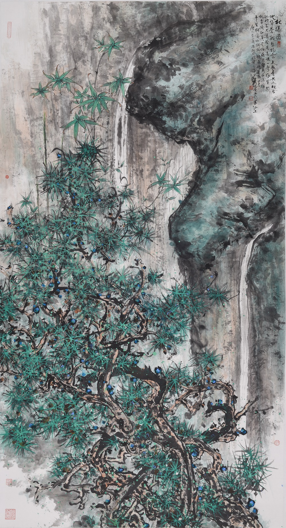 蕭暉榮作品《松瀑圖》,154x83.5cm。