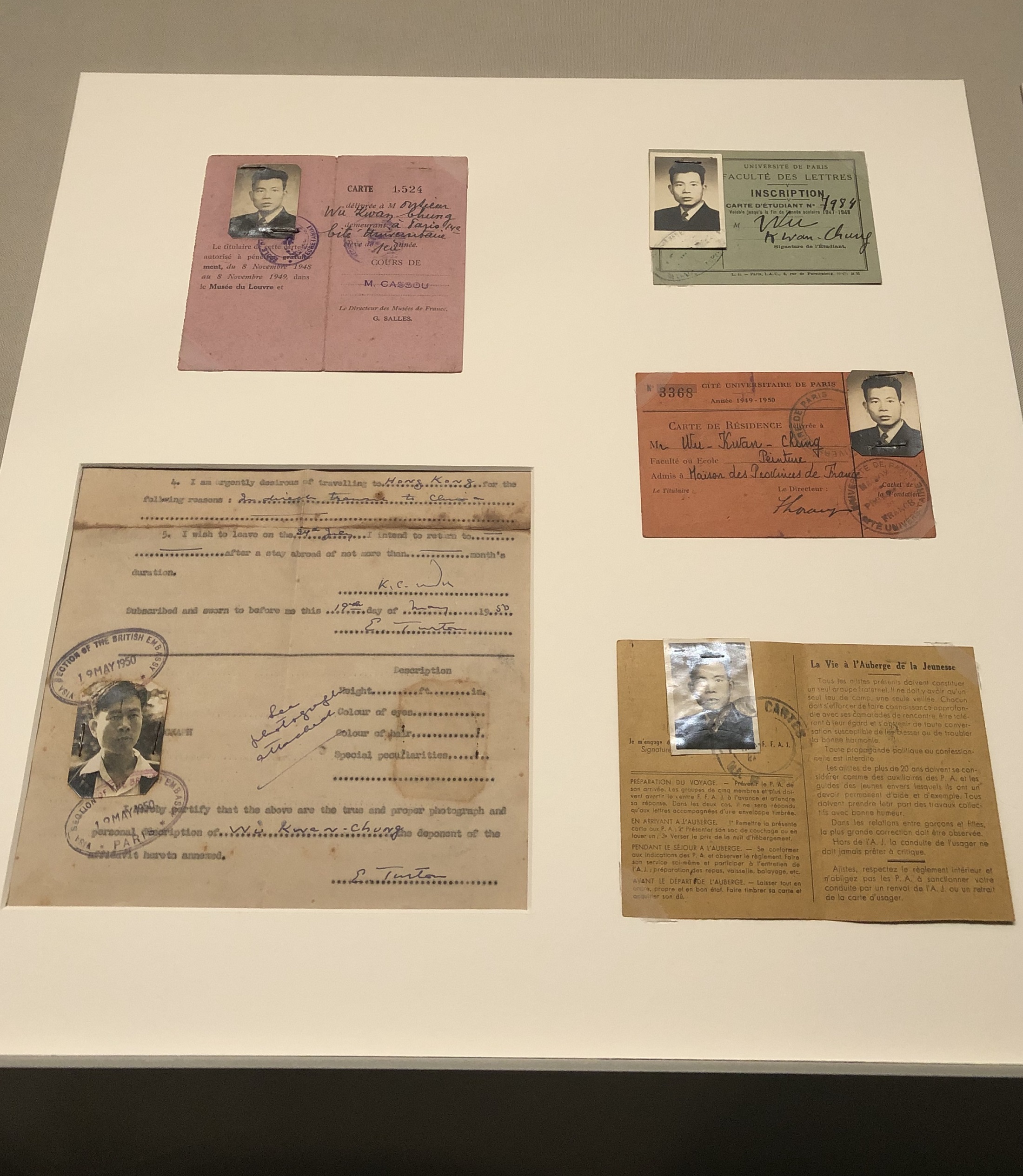 吳冠中留學巴黎的證件,1947-50年。同時也展現吳冠中過境香港簽證的背面。(Janice攝)