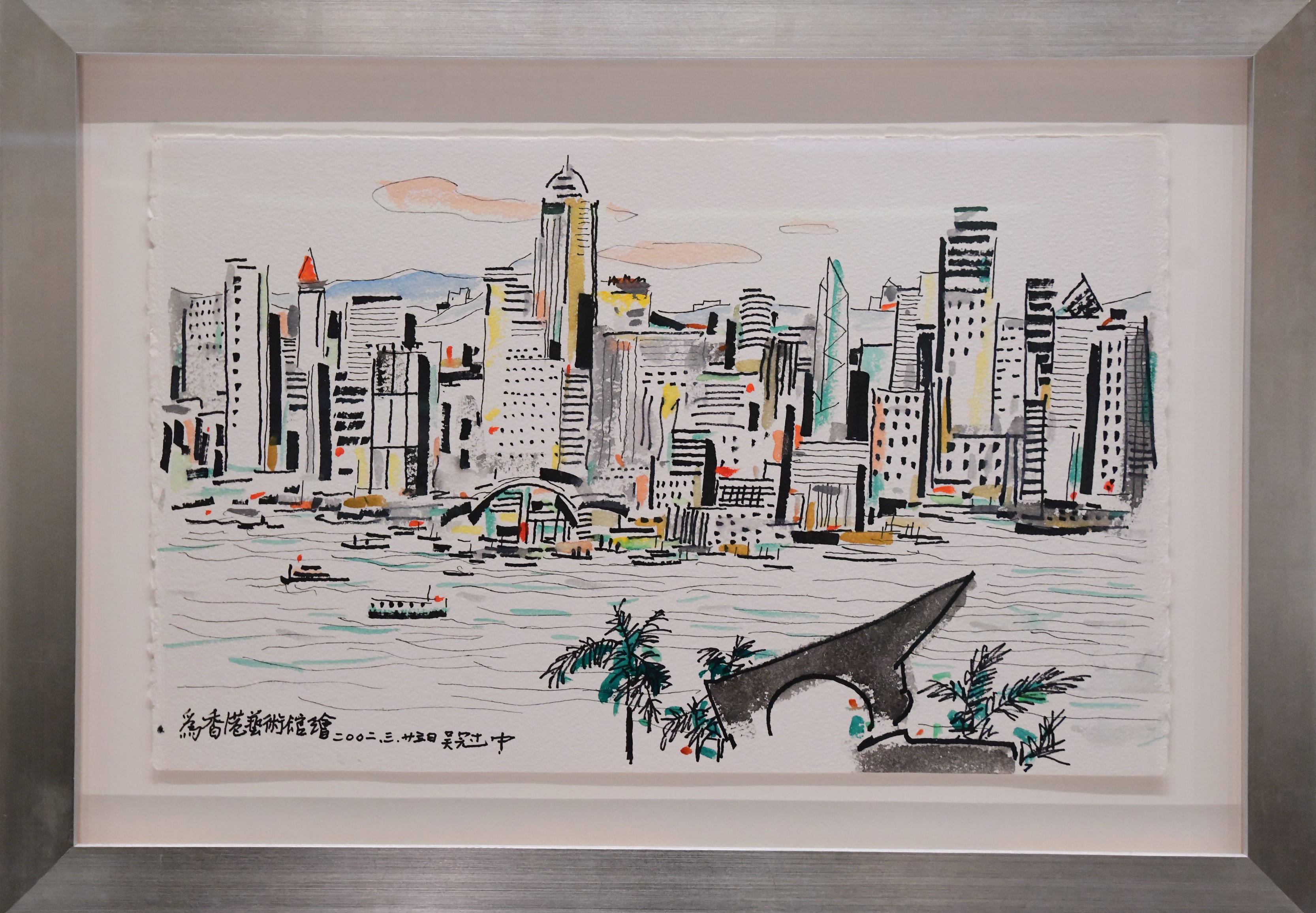 2002年,吳氏答應藝術館在香港示範寫生,亦是多年來他唯一一次公開寫生。「他起初並不答應,我們說服他這是教育活動,勸說他為學生作示範。」藝術館動之以情,曉之以理,最後吳氏被「教育」二字打動。「當天我們搭好平台及工具,他卻不用,看到路過的工作人員推着餐車,二話不說就用此作為工具,下着雨也繪畫《維港寫生》。」司徒氏笑言,吳冠中還說自己畫畫喜歡走來走去,推着餐車倒也方便。「吳冠中曾在農村的艱苦環境中作畫,這種樸素風格直至其成名後也沒有變。」吳氏冒雨描繪維港景色,成為藝壇佳話。