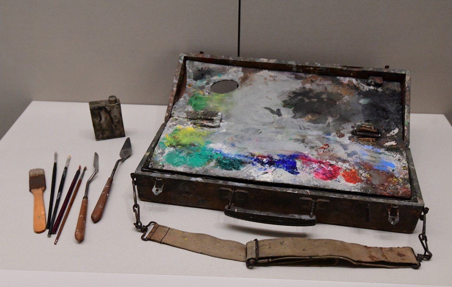 展品「吳冠中畫箱」呈現吳冠中創作歷程,從有些許磨損的背帶可見是常用的工具。