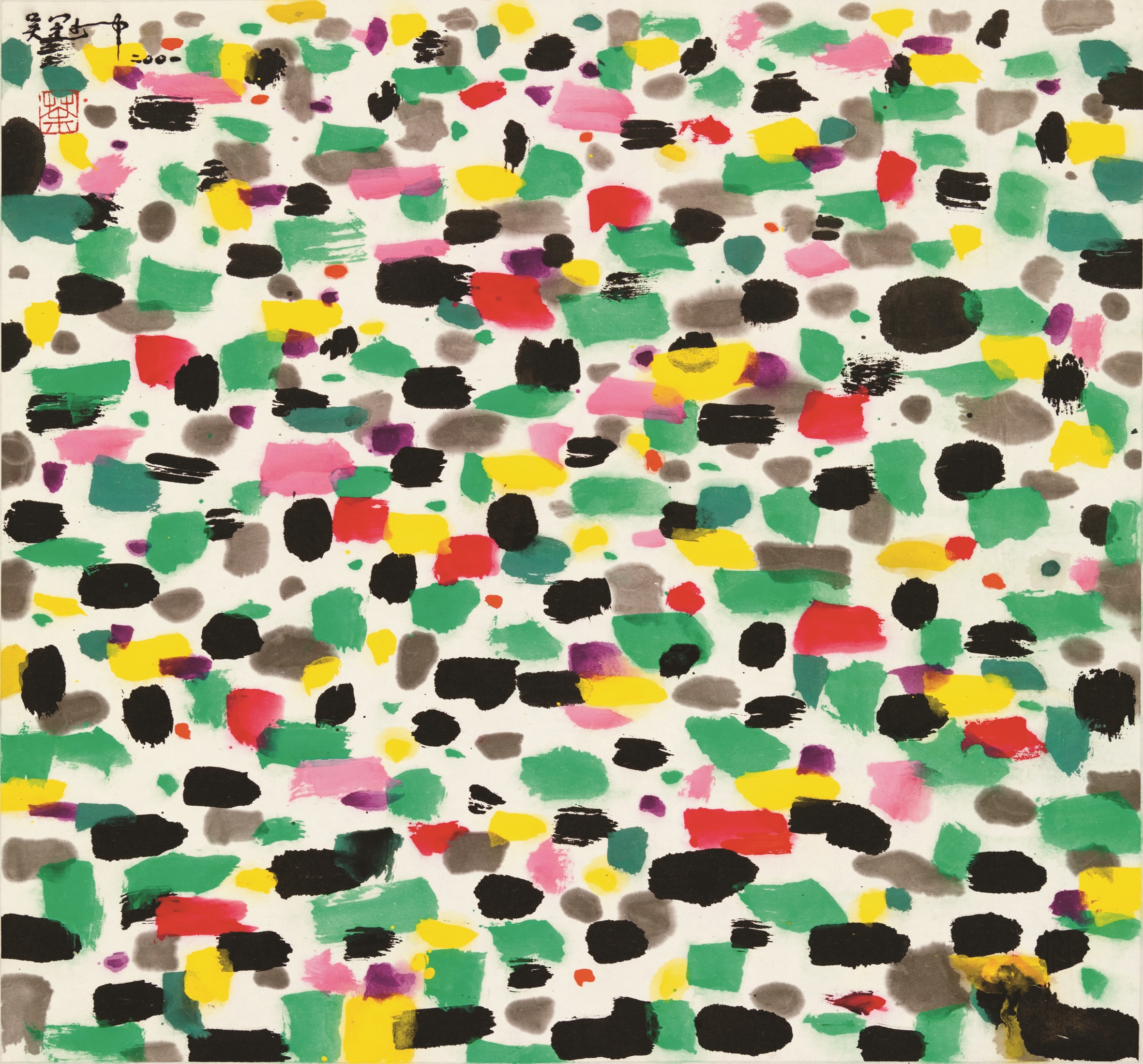 吳冠中作品《朱顏未改》,2001年。此作已精煉至更純粹的視覺元素,成為畫家追求形式美的標誌風格。