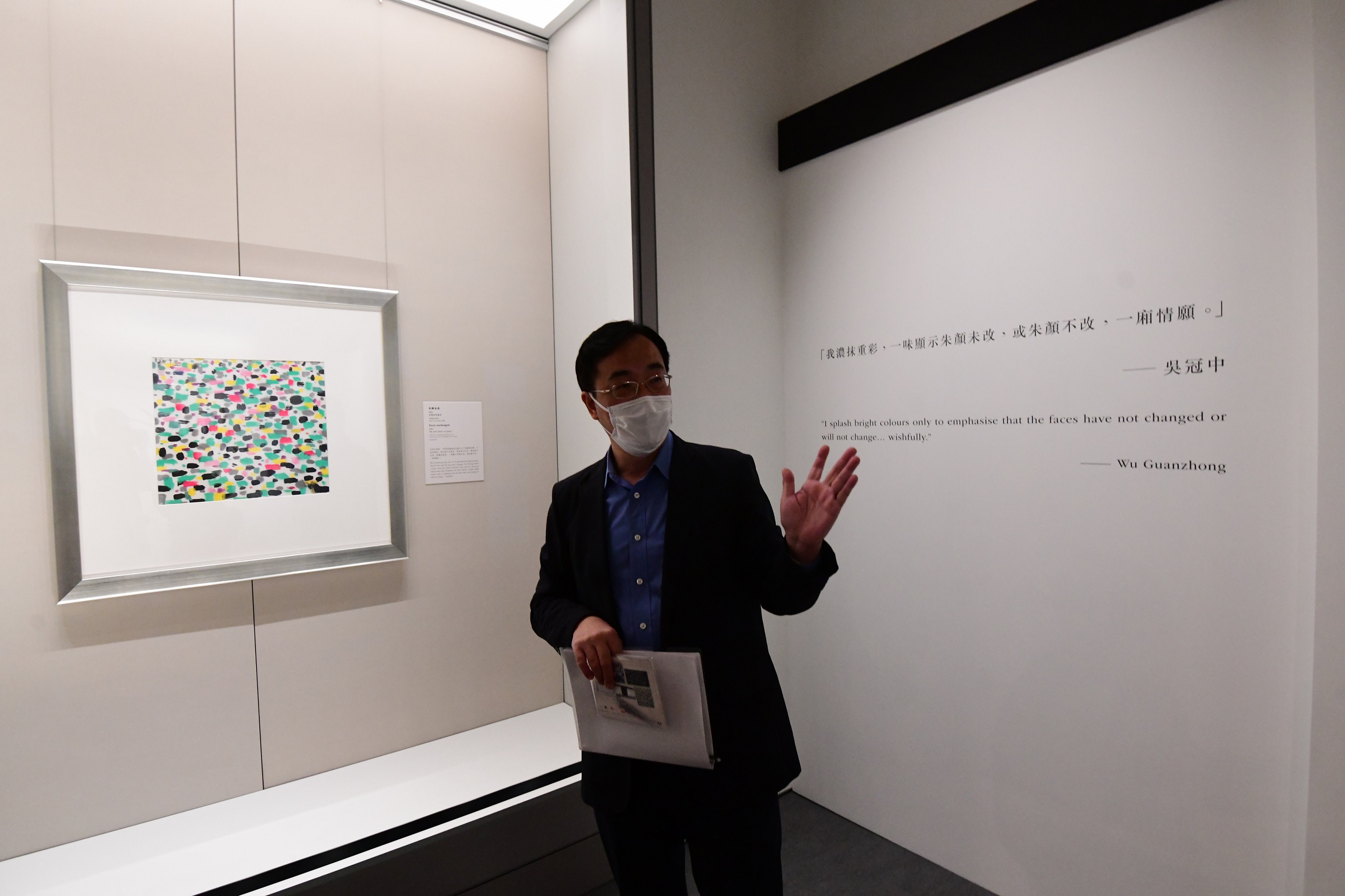 另一幅值得觀看的展品《朱顏未改》,以吳氏標誌性的線條、塊面、彩點組成,作品曾被他長期掛於自家客廳內,直至2010年才連同其餘4幅絕筆畫一同捐出,可想而知畫家有多喜歡。「他喜歡這幅作品的原因是其等於自己的人生宣言,吳氏追求藝術的抽象美,不寫實、不照搬的態度從未改變,他的堅持也成為『招牌』。」特別是上世紀70年代末、80年代初開始運用的彩點,讓人一看便知作品出自吳冠中手筆。「他用的不是三原色,而是不同深淺的紅黃綠彩點。他欣賞色彩斑斕的民間工藝,如版畫門神、布玩偶等,由此誕生彩點。」不同的色彩,令畫面更跳脫、更生活化。