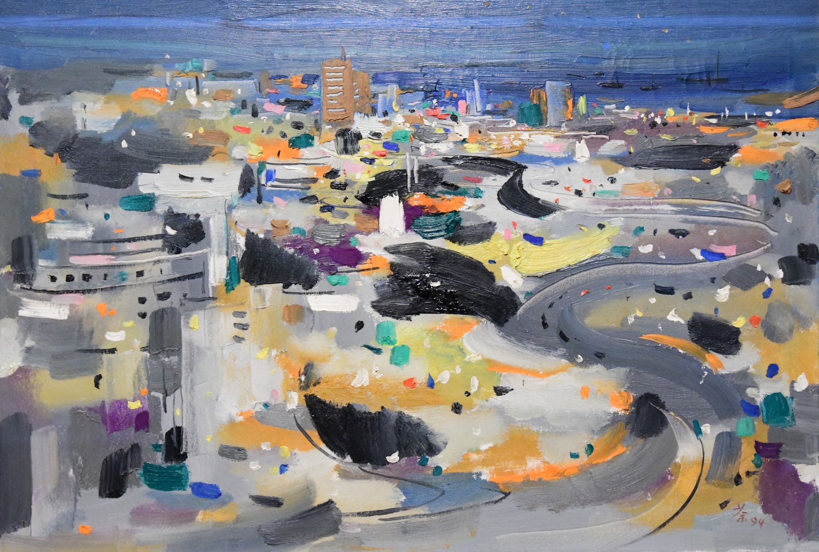 經歷這些事後,他再次踏足香港已經相隔了30年。上世紀80、90年代,他多次受邀來港舉辦展覽,「他第一次來港,覺得香港冷清,遠不及上海繁華,僅是漁港城市。到上世紀80年代再來時,印象與之前全然不同,他覺得這裏是一個開放的城市。」展品《1990年香港寫生(一)》描繪了從半山望下港島的景色,搭配不同顏色的彩點,呈現出繁華都市景象。